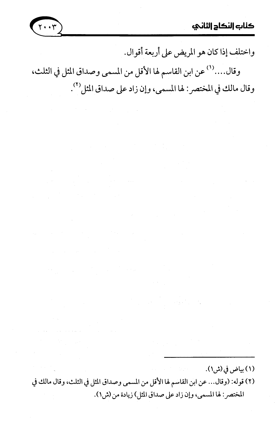 (¬2) قوله: (وقال. . . عن ابن القاسم لها الأقل من المسمى وصداق المثل في الثلث، وقال مالك في المختصر: لها المسمى، وإن زاد على صداق المثل) زيادة من (ش 1).