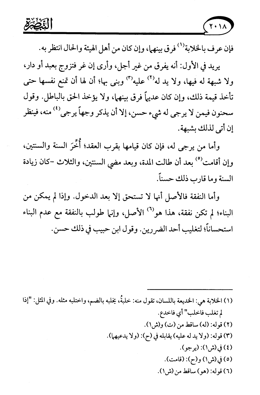 يريد في الأول: أنه يفرق من غير أجل، وأرى إن غير فتزوج بعبد أو دار، ولا شبهة له فيها، ولا يد له (¬2) عليه (¬3) وبنى بها؛ أن لها أن تمنع نفسها حتى تأخذ قيمة ذلك، وإن كان عديمًا فرق بينهما، ولا يؤخذ الحق بالباطل. وقول سحنون فيمن لا يرجى له شيء حسن، إلا أن يذكر وجهًا يرجى (¬4) منه، فينظر إن أتى لذلك بشبهة.