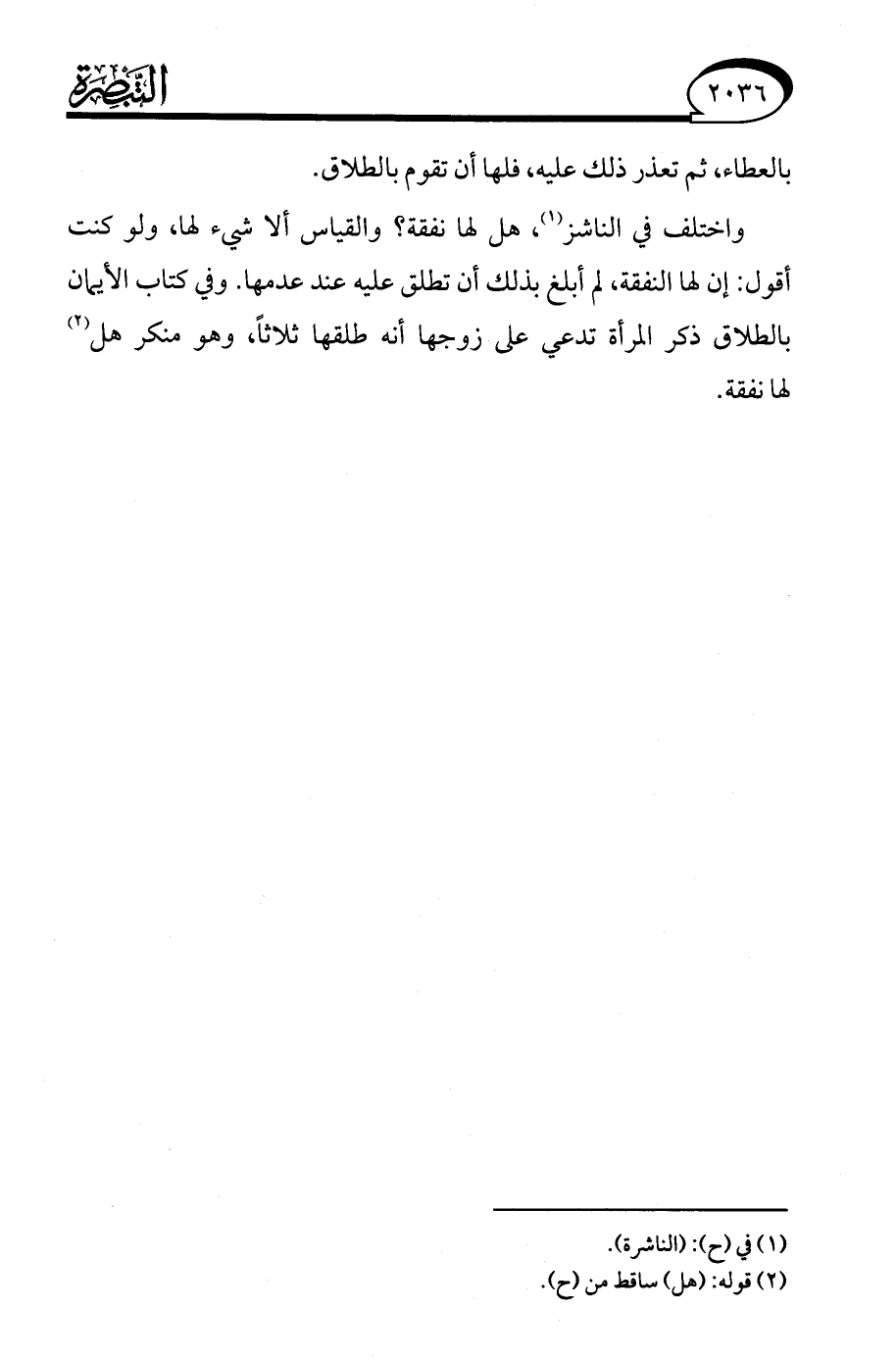 واختلف في الناشز (¬1)، هل لها نفقة؟ والقياس ألا شيء لها، ولو كنت أقول: إن لها النفقة، لم أبلغ بذلك أن تطلق عليه عند عدمها. وفي كتاب الأيمان بالطلاق ذكر المرأة تدعي على زوجها أنه طلقها ثلاثًا، وهو منكر هل (¬2) لها نفقة.