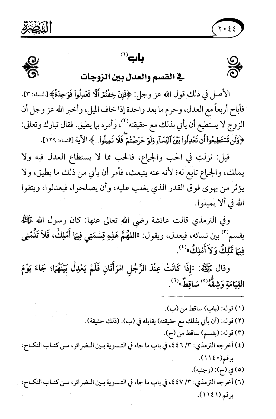 (¬6) أخرجه الترمذي: 3/ 447، في باب ما جاء في التسوية بين الضرائر، من كتاب النكاح، برقم (1141).