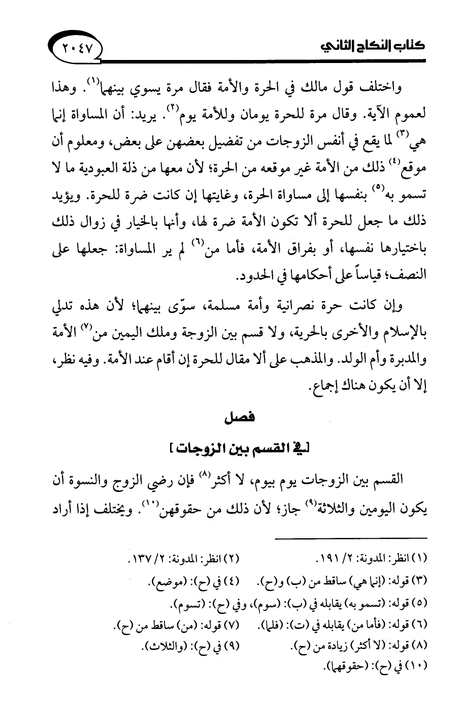 وإن كانت حرة نصرانية وأمة مسلمة، سوّى بينهما؛ لأن هذه تدلي بالإسلام والأخرى بالحرية، ولا قسم بين الزوجة وملك اليمين من (¬7) الأمة والمدبرة وأم الولد. والمذهب على ألا مقال للحرة إن أقام عند الأمة. وفيه نظر، إلا أن يكون هناك إجماع.