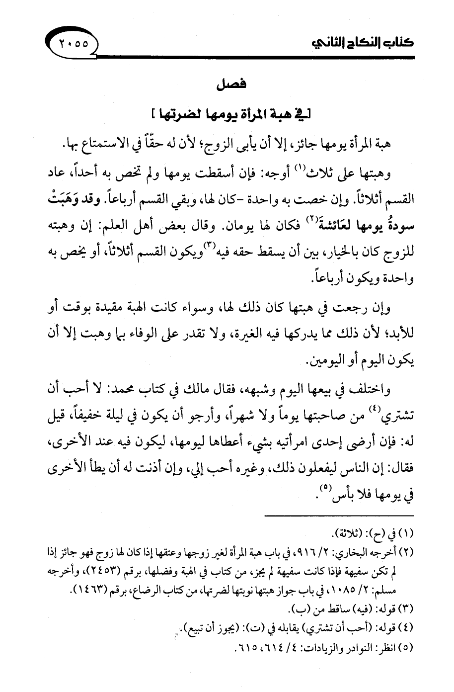 (¬2) أخرجه البخاري: 2/ 916، في باب هبة المرأة لغير زوجها وعتقها إذا كان لها زوج فهو جائز إذا لم تكن سفيهة فإذا كانت سفيهة لم يجز، من كتاب في الهبة وفضلها، برقم (2453)، وأخرجه مسلم: 2/ 1085، في باب جواز هبتها نوبتها لضرتها، من كتاب الرضاع، برقم (1463).