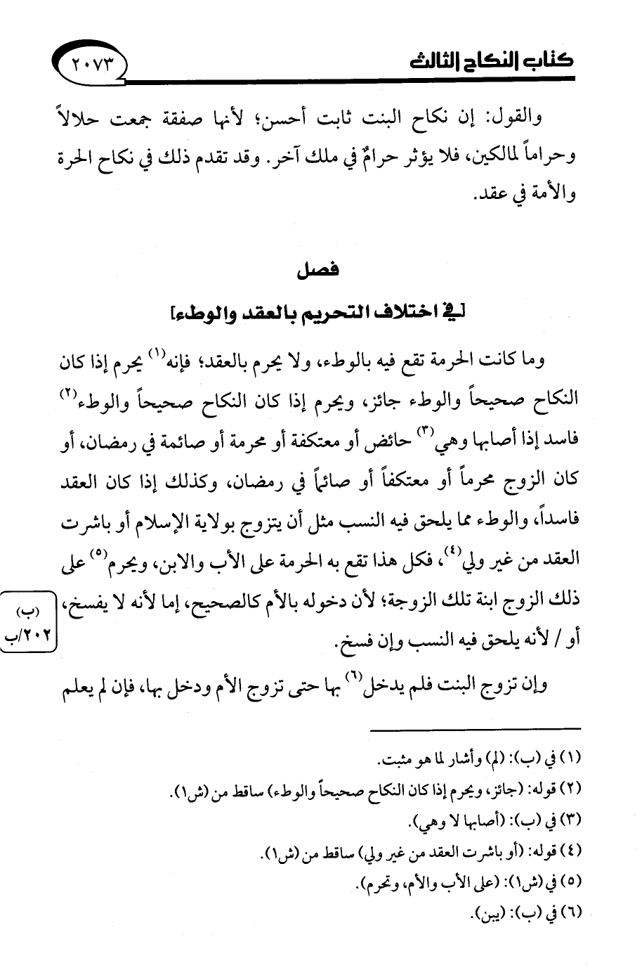 وما كانت الحرمة تقع فيه بالوطء، ولا يحرم بالعقد؛ فإنه (¬1) يحرم إذا كان النكاح صحيحًا والوطء جائز، ويحرم إذا كان النكاح صحيحًا والوطء (¬2) فاسد إذا أصابها وهي (¬3) حائض أو معتكفة أو محرمة أو صائمة في رمضان، أو كان الزوج محرمًا أو معتكفًا أو صائمًا في رمضان، وكذلك إذا كان العقد فاسدًا، والوطء مما يلحق فيه النسب مثل أن يتزوج بولاية الإسلام أو باشرت العقد من غير ولي (¬4)، فكل هذا تقع به الحرمة على الأب والابن، ويحرم (¬5) على ذلك الزوج ابنة تلك الزوجة؛ لأن دخوله بالأم كالصحيح، إما لأنه لا يفسخ، أو لأنه يلحق فيه النسب وإن فسخ.