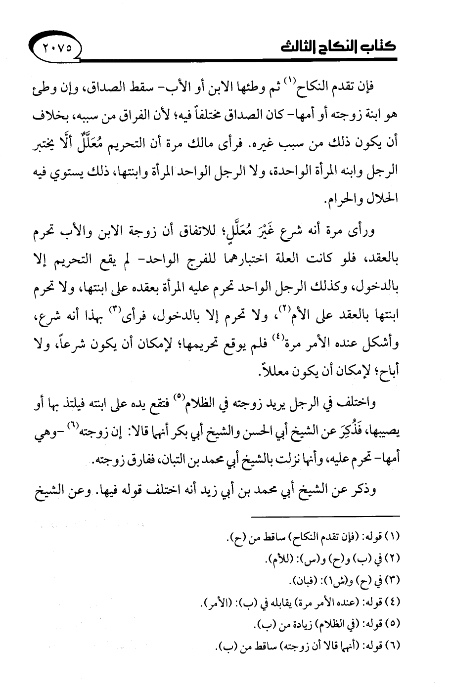 ورأى مرة أنه شرع غَيْرَ مُعَلَّلٍ؛ للاتفاق أن زوجة الابن والأب تحرم بالعقد، فلو كانت العلة اختبارهما للفرج الواحد- لم يقع التحريم إلا بالدخول، وكذلك الرجل الواحد تحرم عليه المرأة بعقده على ابنتها، ولا تحرم ابنتها بالعقد على الأم (¬2)، ولا تحرم إلا بالدخول، فرأى (¬3) بهذا أنه شرع، وأشكل عنده الأمر مرة (¬4) فلم يوقع تحريمها؛ لإمكان أن يكون شرعًا، ولا أباح؛ لإمكان أن يكون معللًا.