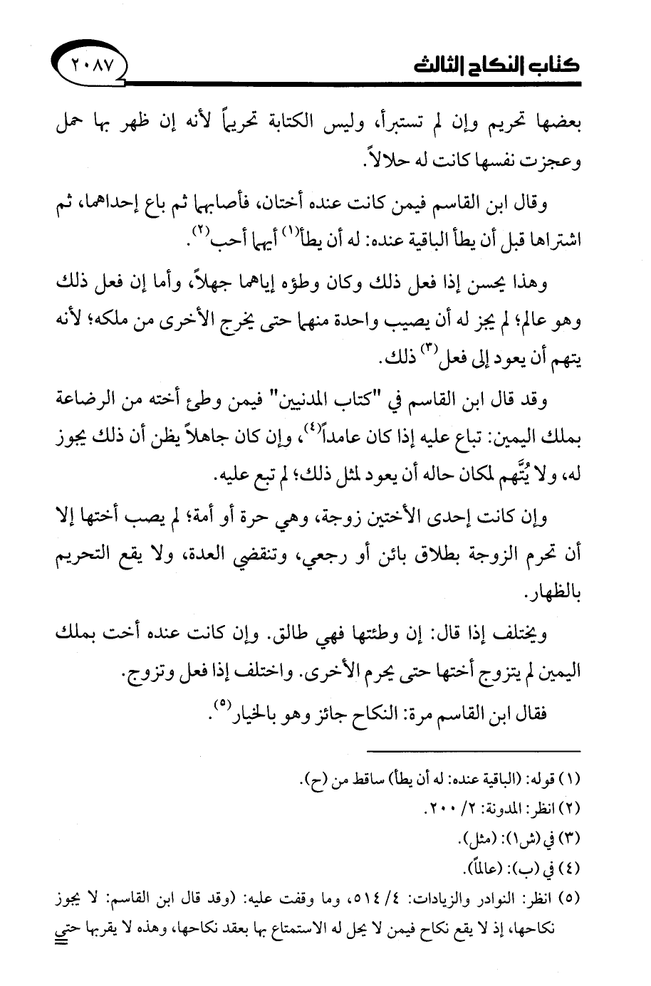 (¬5) انظر: النوادر والزيادات: 4/ 514، وما وقفت عليه: (وقد قال ابن القاسم: لا يجوز نكاحها، إذ لا يقع نكاح فيمن لا يحل له الاستمتاع بها بعقد نكاحها، وهذه لا يقر بها حتي =