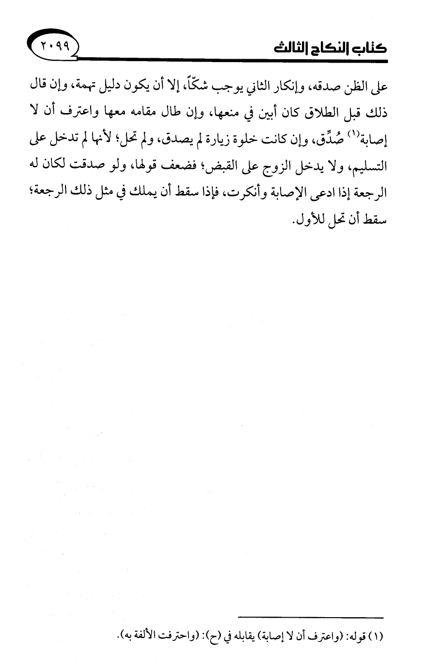 على الظن صدقه، وإنكار الثاني يوجب شكًّا، إلا أن يكون دليل تهمة، وإن قال ذلك قبل الطلاق كان أبين في منعها، وإن طال مقامه معها واعترف أن لا إصابة (¬1) صُدِّق، وإن كانت خلوة زيارة لم يصدق، ولم تحل؛ لأنها لم تدخل على التسليم، ولا يدخل الزوج على القبض؛ فضعف قولها، ولو صدقت لكان له الرجعة إذا ادعى الإصابة وأنكرت، فإذا سقط أن يملك في مثل ذلك الرجعة، سقط أن تحل للأول.
