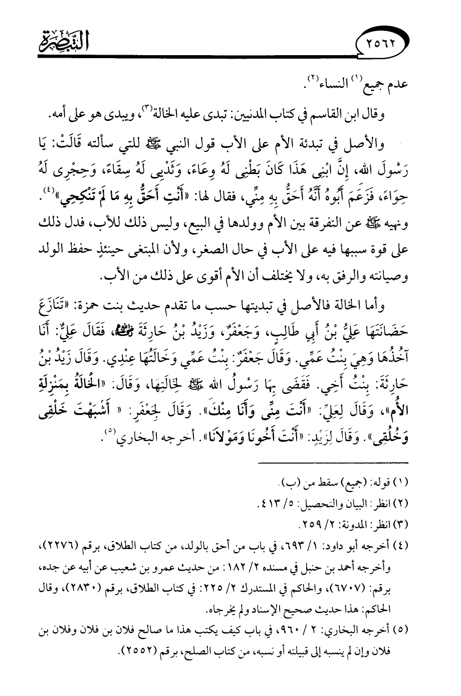 وأما الخالة فالأصل في تبديتها حسب ما تقدم حديث بنت حمزة: "تَنَازَعَ حَضَانَتَهَا عَلِيُّ بْنُ أَبِي طَالِبٍ، وَجَعْفَرٌ، وَزَيْدُ بْنُ حَارِثَةَ - رضي الله عنهم -، فَقَالَ عَليٌّ: أَنَا آخُذُهَا وَهِيَ بِنْتُ عَمِّي. وَقَالَ جَعْفَرٌ: بِنْتُ عَمِّي وَخَالَتُهَا عِنْدِي. وَقَالَ زَيْدُ بْنُ حَارِثَةَ: بِنْتُ أَخِي. فَقَضَى بِهَا رَسْولُ اللهِ - صلى الله عليه وسلم - لخِالَتِهَا، وَقَالَ: "الخالَةُ بِمَنْزِلَةِ الأُم"، وَقَالَ لِعَليِّ. "أَنْتَ مِنِّى وَأَنَا مِنْكَ". وَقَالَ لجِعْفَرٍ: "أَشبَهْتَ خَلْقِى وَخُلُقِى". وَقَالَ لِزَيْدٍ: "أَنْتَ أَخُونَا وَمَوْلانَا". أخرجه البخاري (¬5).