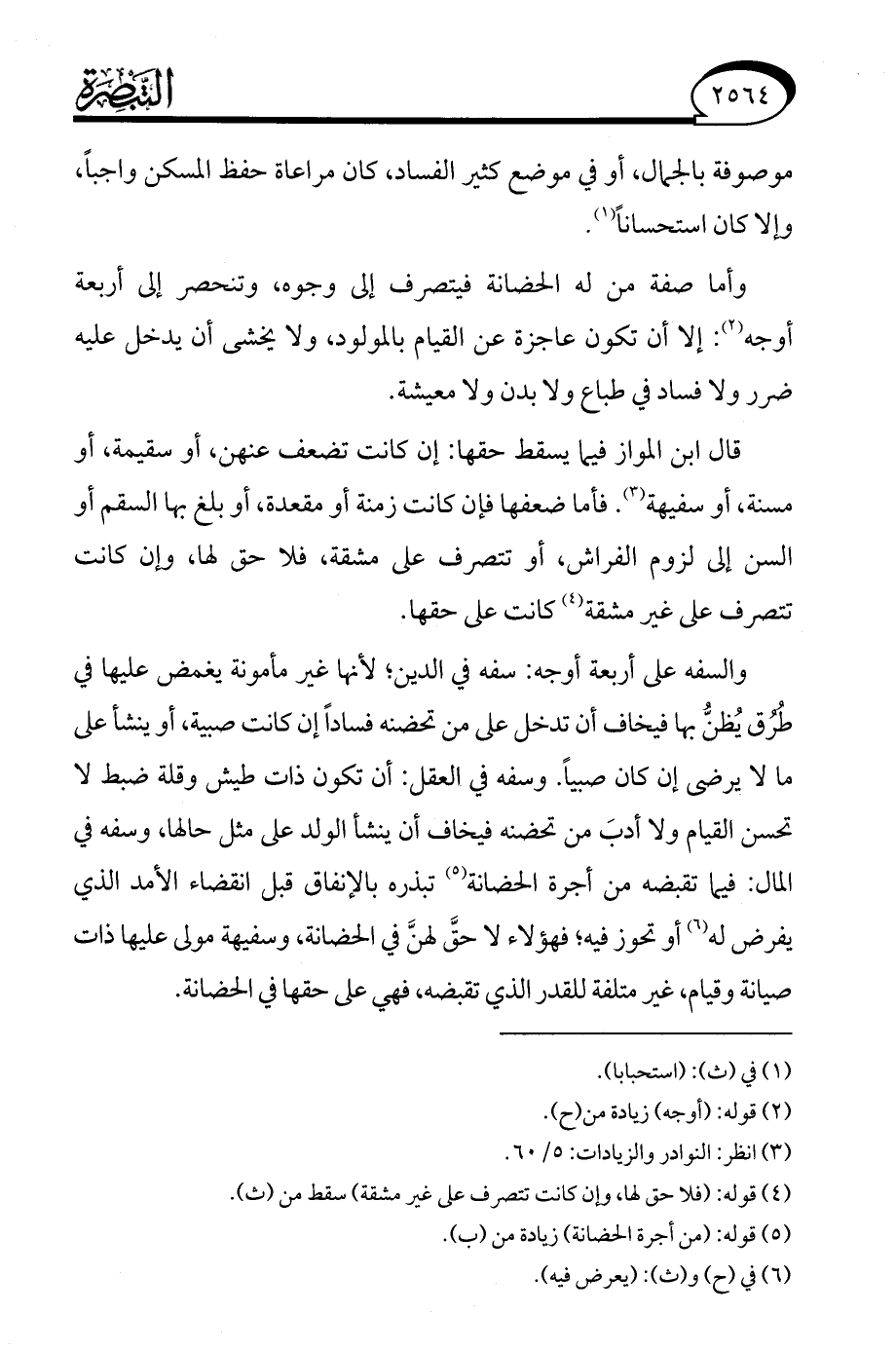 والسفه على أربعة أوجه: سفه في الدين؛ لأنها غير مأمونة يغمض عليها في طرق يُظنُّ بها فيخاف أن تدخل على من تحضنه فسادًا إن كانت صبية، أو ينشأ على ما لا يرضى إن كان صبيًا. وسفه في العقل: أن تكون ذات طيش وقلة ضبط لا تحسن القيام ولا أدبَ من تحضنه فيخاف أن ينشأ الولد على مثل حالها، وسفه في المال: فيما تقبضه من أجرة الحضانة (¬5) تبذره بالإنفاق قبل انقضاء الأمد الذي يفرض له (¬6) أو تحوز فيه؛ فهؤلاء لا حقَّ لهنَّ في الحضانة، وسفيهة مولى عليها ذات صيانة وقيام، غير متلفة للقدر الذي تقبضه، فهي على حقها في الحضانة.