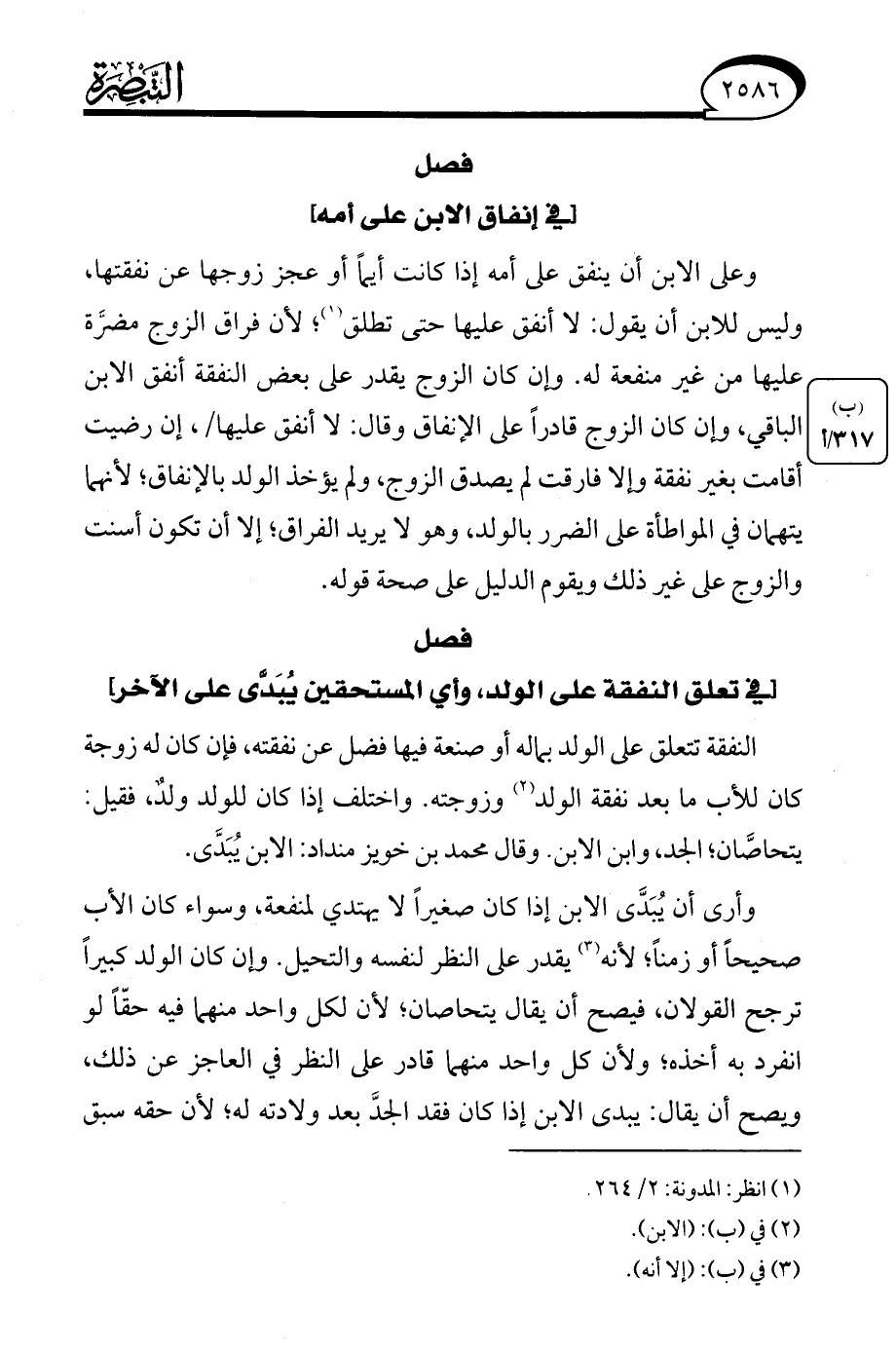 وعلى الابن أن ينفق على أمه إذا كانت أيمًا أو عجز زوجها عن نفقتها، وليس للابن أن يقول: لا أنفق عليها حتى تطلق (¬1)؛ لأن فراق الزوج مضرَّة عليها من غير منفعة له. وإن كان الزوج يقدر علي بعض النفقة أنفق الابن الباقي, وإن كان الزوج قادرًا علي الإنفاق وقال: لا أنفق عليها, إن رضيت أقامت بغير نفقة وإلا فارقت لم يصدق الزوج، ولم يؤخذ الولد بالإنفاق؛ لأنهما يتهمان في المواطأة على الضرر بالولد، وهو لا يريد الفراق، إلا أن تكون أسنت والزوج على غير ذلك ويقوم الدليل على صحة قوله.