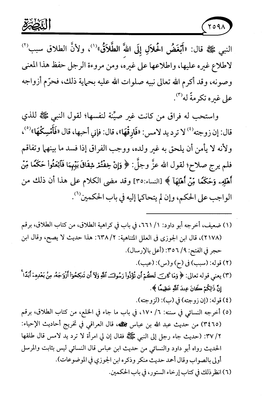 (¬5) أخرجه النسائي في سننه: 6/ 170، في باب ما جاء في الخلع، من كتاب الطلاق، برقم (3465) من حديث عبد الله بن عباس - رضي الله عنه -، قال العراقي في تخريج أحاديث الإحياء: 2/ 37: (حديث جاء رجل إلى النبي - صلى الله عليه وسلم - فقال إن لي امرأة لا ترد يد لامس قال طلقها الحديث رواه أبو داود والنسائي من حديث ابن عباس قال النسائي ليس بثابت والمرسل أولى بالصواب وقال أحمد حديث منكر وذكره ابن الجوزي في الموضوعات).