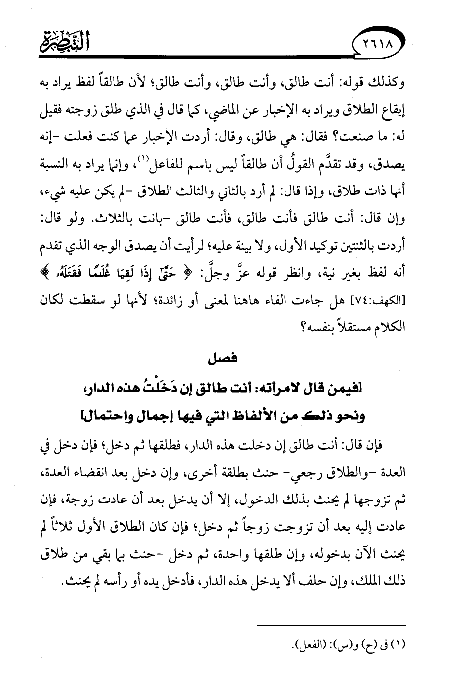 فصل [فيمن قال لامرأته: أنت طالق إن دَخَلْتُ هذه الدار, ونحو ذلك من الألفاظ التي فيها إجمال واحتمال]