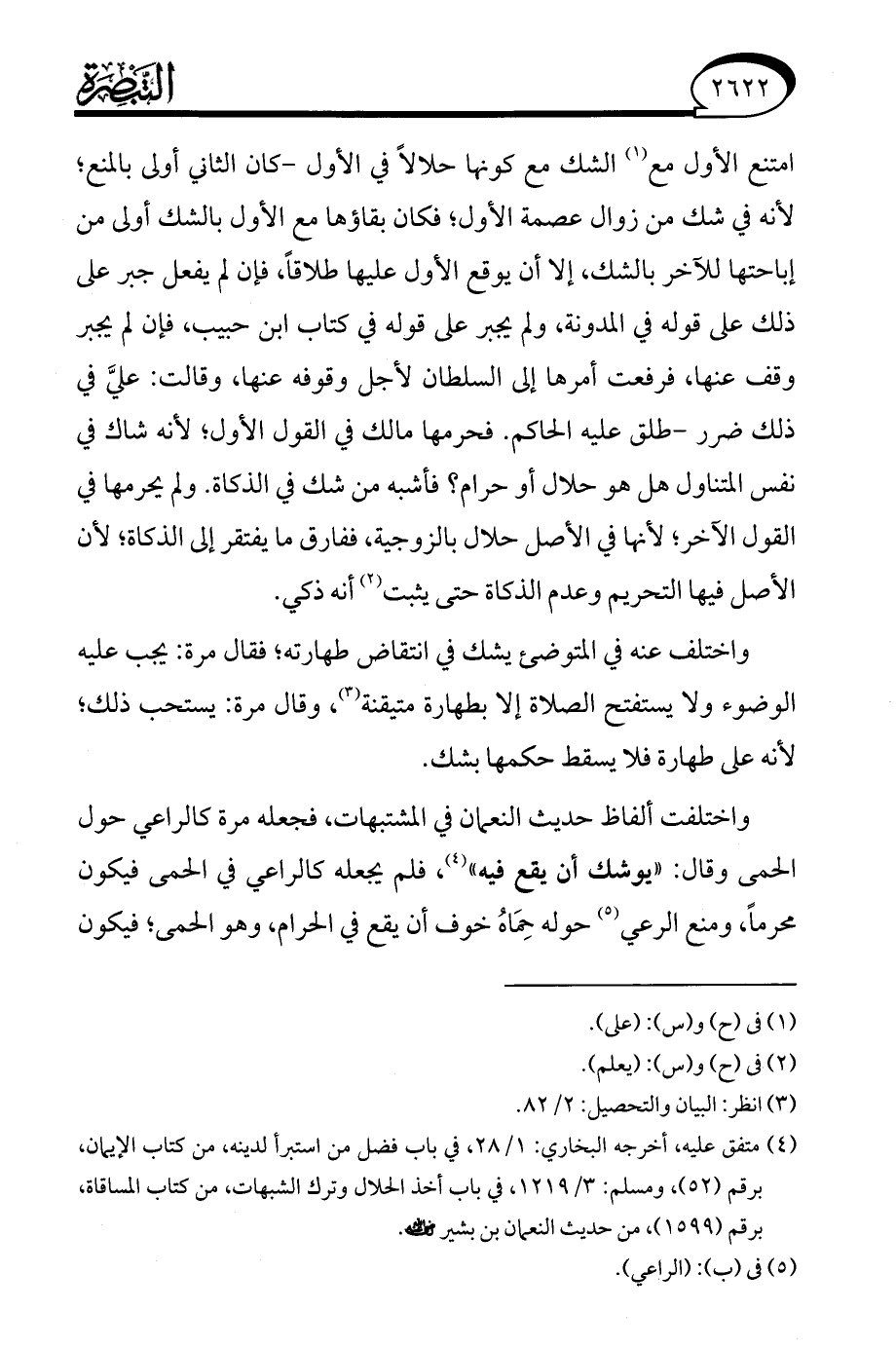 واختلفت ألفاظ حديث النعمان في المشتبهات، فجعله مرة كالراعي حول الحمى وقال: "يوشك أن يقع فيه" (¬4)، فلم يجعله كالراعي في الحمى فيكون محرمًا، ومنع الرعي (¬5) حوله حِمَاهُ خوف أن يقع في الحرام، وهو الحمى، فيكون