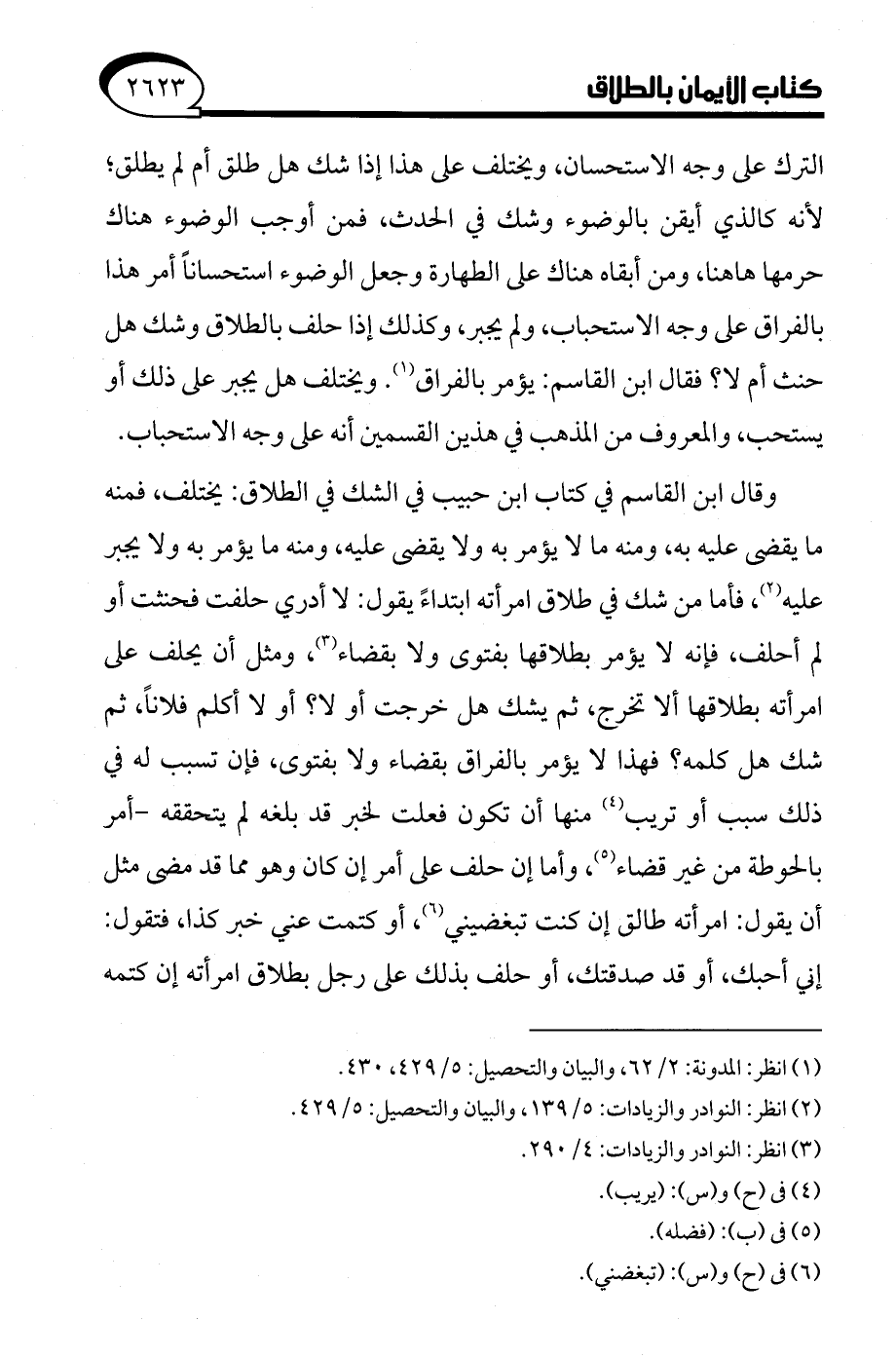 وقال ابن القاسم في كتاب ابن حبيب في الشك في الطلاق: يختلف، فمنه ما يقضى عليه به، ومنه ما لا يؤمر به ولا يقضى عليه، ومنه ما يؤمر به ولا يجبر عليه (¬2)، فأما من شك في طلاق امرأته ابتداءً يقول: لا أدري حلفت فحنثت أو لم أحلف، فإنه لا يؤمر بطلاقها بفتوى ولا بقضاء (¬3)، ومثل أن يحلف على امرأته بطلاقها ألا تخرج، ثم يشك هل خرجت أو لا؟ أو لا أكلم فلانًا، ثم شك هل كلمه؟ فهذا لا يؤمر بالفراق بقضاء ولا بفتوى، فإن تسبب له في ذلك سبب أو تريب (¬4) منها أن تكون فعلت لخبر قد بلغه لم يتحققه- أمر بالحوطة من غير قضاء (¬5)، وأما إن حلف على أمر إن كان وهو مما قد مضى مثل أن يقول: امرأته طالق إن كنت تبغضيني (¬6)، أو كتمت عني خبر كذا، فتقول: إني أحبك، أو قد صدقتك، أو حلف بذلك على رجل بطلاق امرأته إن كتمه