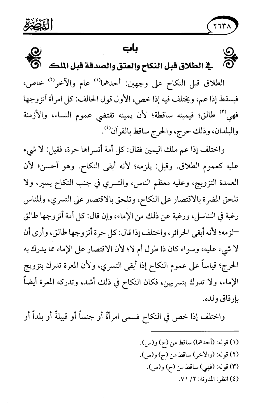 واختلف إذا عم ملك اليمين فقال: كل أمة أتسراها حرة، فقيل: لا شيء عليه كعموم الطلاق. وقيل: يلزمه؛ لأنه أبقى النكاح. وهو أحسن؛ لأن العمدة التزويج، وعليه معظم الناس، والتسري في جنب النكاح يسير، ولا تلحق المضرة بالاقتصار على النكاح، وتلحق بالاقتصار على التسري، وللناس رغبة في التناسل، ورغبة عن ذلك من الإماء، وإن قال: كل أمة أتزوجها طالق - لزمه؛ لأنه أبقى الحرائر، واختلف إذا قال: كل حرة أتزوجها طالق، وأرى أن لا شيء عليه، وسواء كان ذا طول أم لا؛ لأن الاقتصار على الإماء مما يدرك به الحرج، قياسًا على عموم النكاح إذا أبقى التسري، ولأن المعرة تدرك بتزويج الإماء، ولا تدرك بتسريهن، فكان النكاح في ذلك أشد، وتدركه المعرة أيضًا بإرقاق ولده.