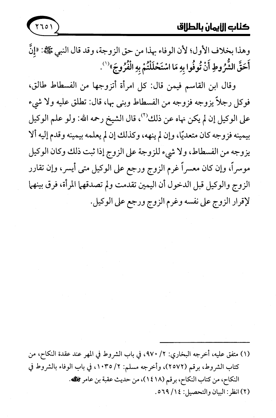 (¬1) متفق عليه، أخرجه البخاري: 2/ 970، في باب الشروط في المهر عند عقدة النكاح، من كتاب الشروط، برقم (2572)، وأخرجه مسلم: 2/ 1035، في باب الوفاء بالشروط في النكاح، من كتاب النكاح، برقم (1418)، من حديث عقبة بن عامر - رضي الله عنه -.