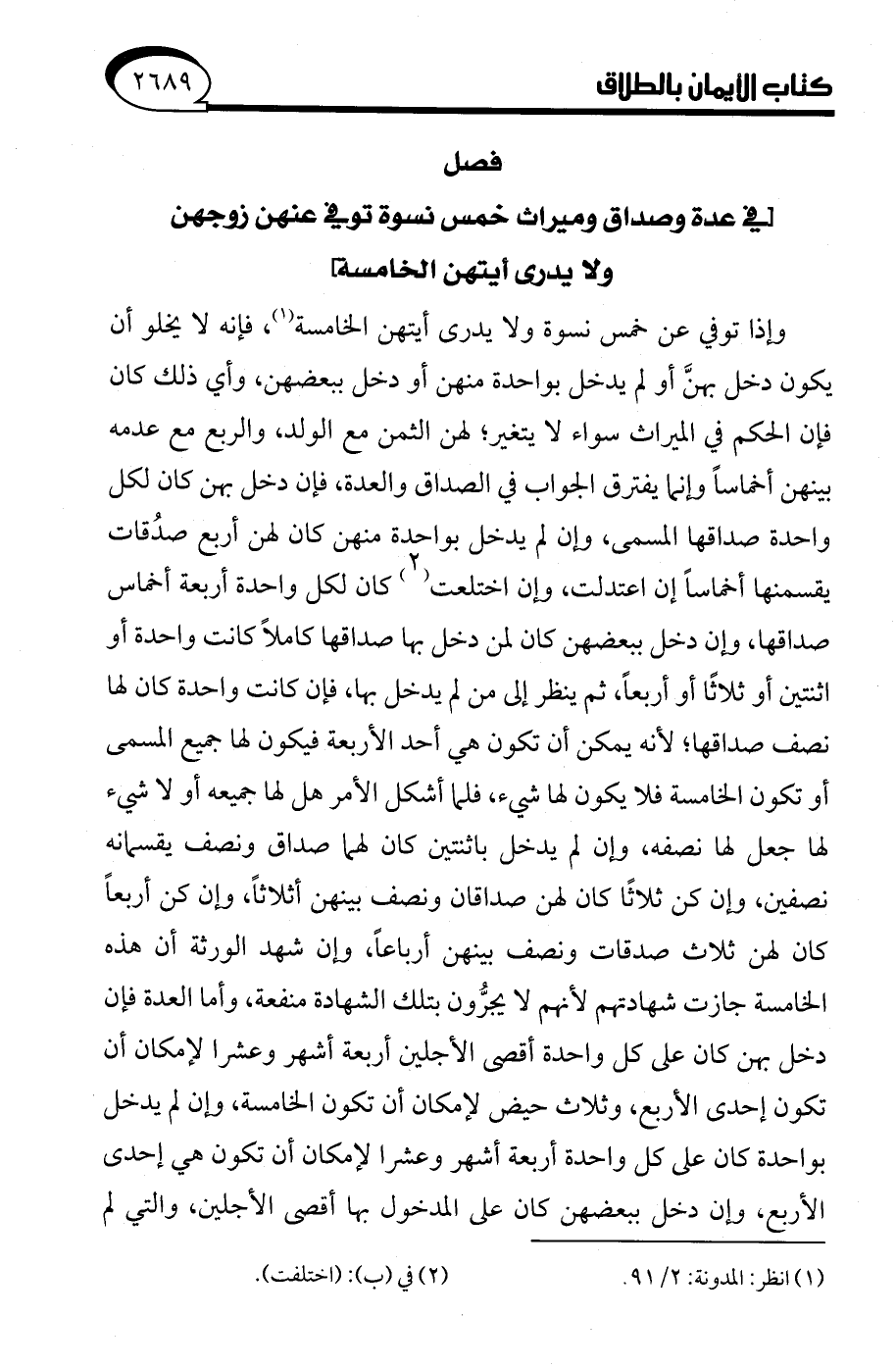 وإذا توفي عن خمس نسوة ولا يدرى أيتهن الخامسة (¬1)، فإنه لا يخلو أن يكون دخل بهنَّ أو لم يدخل بواحدة منهن أو دخل ببعضهن، وأي ذلك كان فإن الحكم في الميراث سواء لا يتغير؛ لهن الثمن مع الولد، والربع مع عدمه بينهن أخماسًا وإنما يفترق الجواب في الصداق والعدة، فإن دخل بهن كان لكل واحدة صداقها المسمى، وإن لم يدخل بواحدة منهن كان لهن أربع صدُقات يقسمنها أخماسًا إن اعتدلت، وإن اختلعت (¬2) كان لكل واحدة أربعة أخماس صداقها، وإن دخل ببعضهن كان لمن دخل بها صداقها كاملًا كانت واحدة أو اثنتين أو ثلاثًا أو أربعًا، ثم ينظر إلى من لم يدخل بها، فإن كانت واحدة كان لها نصف صداقها؛ لأنه يمكن أن تكون هي أحد الأربعة فيكون لها جميع المسمى أو تكون الخامسة فلا يكون لها شيء، فلما أشكل الأمر هل لها جميعه أو لا شيء لها جعل لها نصفه، وإن لم يدخل باثنتين كان لهما صداق ونصف يقسمانه نصفين، وإن كن ثلاثًا كان لهن صداقان ونصف بينهن أثلاثًا، وإن كن أربعًا كان لهن ثلاث صدقات ونصف بينهن أرباعًا، وإن شهد الورثة أن هذه الخامسة جازت شهادتهم لأنهم لا يجرُّون بتلك الشهادة منفعة، وأما العدة فإن دخل بهن كان على كل واحدة أقصى الأجلين أربعة أشهر وعشرا لإمكان أن تكون إحدى الأربع، وثلاث حيض لإمكان أن تكون الخامسة، وإن لم يدخل بواحدة كان على كل واحدة أربعة أشهر وعشرا لإمكان أن تكون هي إحدى الأربع، وإن دخل ببعضهن كان على المدخول بها أقصى الأجلين، والتي لم