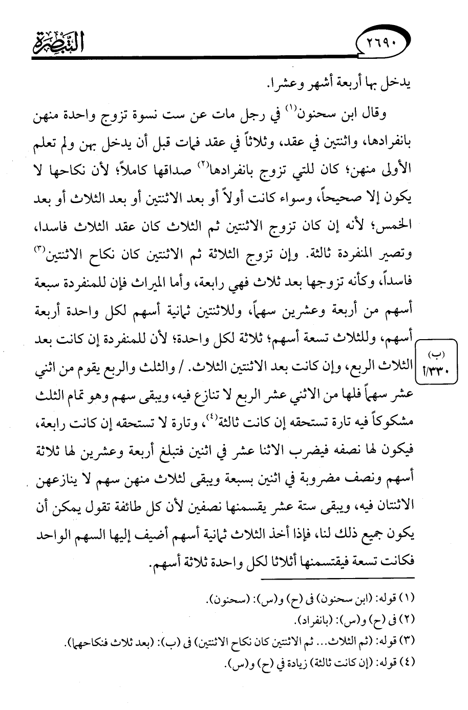 وقال ابن سحنون (¬1) في رجل مات عن ست نسوة تزوج واحدة منهن بانفرادها، واثنتين في عقد، وثلاثًا في عقد فمات قبل أن يدخل بهن ولم تعلم الأولى منهن، كان للتي تزوج بانفرادها (¬2) صداقها كاملًا؛ لأن نكاحها لا يكون إلا صحيحًا، وسواء كانت أولًا أو بعد الاثنتين أو بعد الثلاث أو بعد الخمس؛ لأنه إن كان تزوج الاثنتين ثم الثلاث كان عقد الثلاث فاسدا، وتصير النفردة ثالثة. وإن تزوج الثلاثة ثم الاثنتين كان نكاح الاثنتين (¬3) فاسدًا، وكأنه تزوجها بعد ثلاث فهي رابعة، وأما الميراث فإن للمنفردة سبعة أسهم من أربعة وعشرين سهمًا، وللاثنتين ثمانية أسهم لكل واحدة أربعة أسهم، وللثلاث تسعة أسهم، ثلاثة لكل واحدة؛ لأن للمنفردة إن كانت بعد الثلاث الربع، وإن كانت بعد الاثنتين الثلاث. والثلث والربع يقوم من اثني عشر سهمًا فلها من الاثني عشر الربع لا تنازع فيه، ويبقى سهم وهو تمام الثلث مشكوكًا فيه تارة تستحقه إن كانت ثالثة (¬4)، وتارة لا تستحقه إن كانت رابعة، فيكون لها نصفه فيضرب الاثنا عشر في اثنين فتبلغ أربعة وعشرين لها ثلاثة أسهم ونصف مضروبة في اثنين بسبعة ويبقى لثلاث منهن سهم لا ينازعهن الاثنتان فيه، ويبقى ستة عشر يقسمنها نصفين لأن كل طائفة تقول يمكن أن يكون جميع ذلك لنا، فإذا أخذ الثلاث ثمانية أسهم أضيف إليها السهم الواحد فكانت تسعة فيقتسمنها أثلاثا لكل واحدة ثلاثة أسهم.