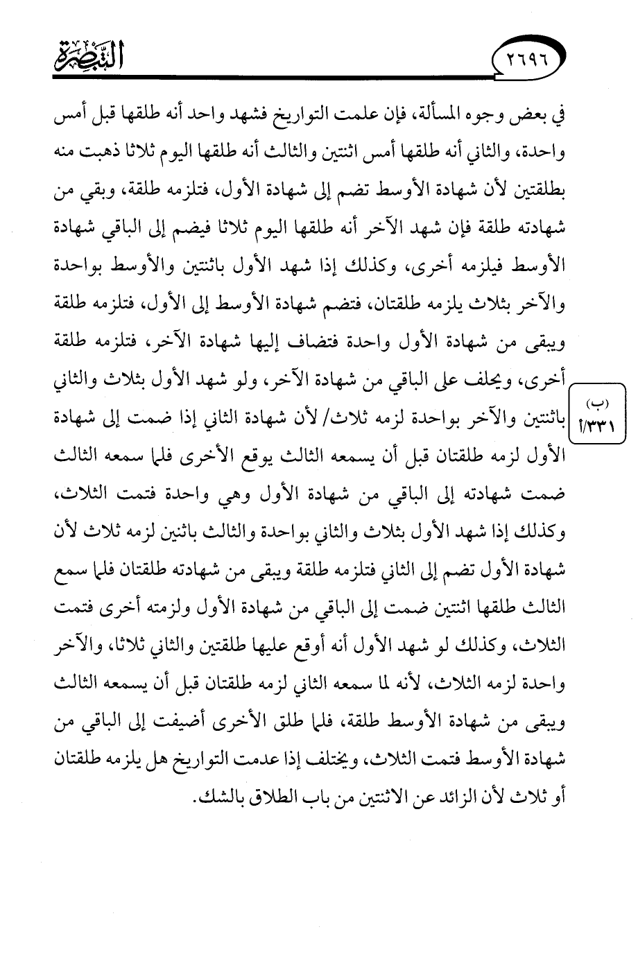 في بعض وجوه المسألة، فإن علمت التواريخ فشهد واحد أنه طلقها قبل أمس واحدة، والثاني أنه طلقها أمس اثنتين والثالث أنه طلقها اليوم ثلاثا ذهبت منه بطلقتين لأن شهادة الأوسط تضم إلى شهادة الأول، فتلزمه طلقة، وبقي من شهادته طلقة فإن شهد الآخر أنه طلقها اليوم ثلاثا فيضم إلى الباقي شهادة الأوسط فيلزمه أخرى، وكذلك إذا شهد الأول باثنتين والأوسط بواحدة والآخر بثلاث يلزمه طلقتان، فتضم شهادة الأوسط إلى الأول، فتلزمه طلقة ويبقى من شهادة الأول واحدة فتضاف إليها شهادة الآخر، فتلزمه طلقة أخرى، ويحلف على الباقي من شهادة الآخر، ولو شهد الأول بثلاث والثاني باثنتين والآخر بواحدة لزمه ثلاث لأن شهادة الثاني إذا ضمت إلى شهادة الأول لزمه طلقتان قبل أن يسمعه الثالث يوقع الأخرى فلما سمعه الثالث ضمت شهادته إلى الباقي من شهادة الأول وهي واحدة فتمت الثلاث، وكذلك إذا شهد الأول بثلاث والثاني بواحدة والثالث باثنين لزمه ثلاث لأن شهادة الأول تضم إلى الثاني فتلزمه طلقة ويبقى من شهادته طلقتان فلما سمع الثالث طلقها اثنتين ضمت إلى الباقي من شهادة الأول ولزمته أخرى فتمت الثلاث، وكذلك لو شهد الأول أنه أوقع عليها طلقتين والثاني ثلاثا، والآخر واحدة لزمه الثلاث؛ لأنه لما سمعه الثاني لزمه طلقتان قبل أن يسمعه الثالث ويبقى من شهادة الأوسط طلقة، فلما طلق الأخرى أضيفت إلى الباقي من شهادة الأوسط فتمت الثلاث، ويختلف إذا عدمت التواريخ هل يلزمه طلقتان أو ثلاث لأن الزائد عن الاثنتين من باب الطلاق بالشك.