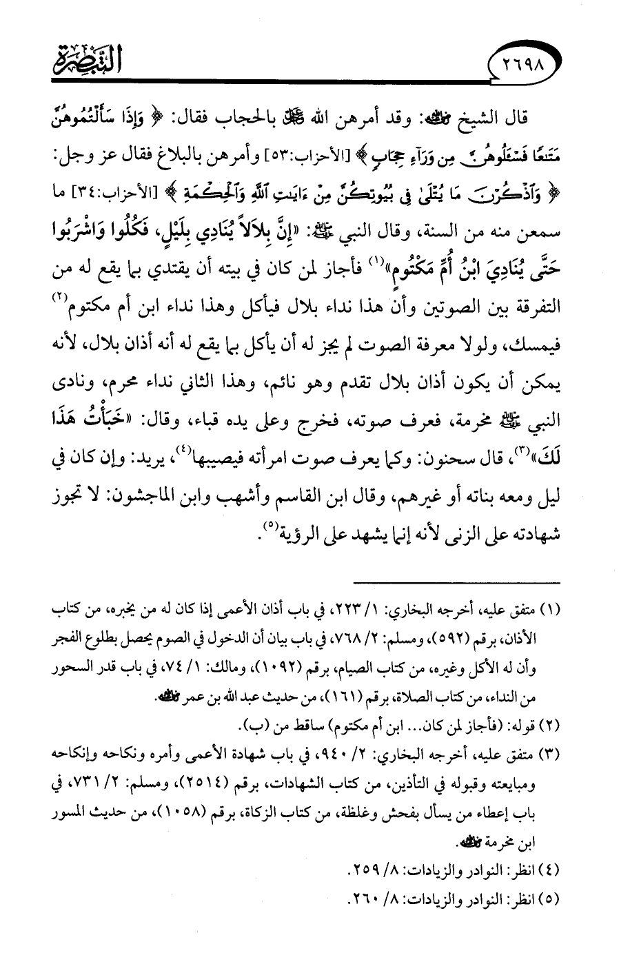 قال الشيخ - رضي الله عنه -: وقد أمرهن الله -عز وجل- بالحجاب فقال: {وَإِذَا سَأَلْتُمُوهُنَّ مَتَاعًا فَاسْأَلُوهُنَّ مِنْ وَرَاءِ حِجَابٍ} [الأحزاب: 53] وأمرهن بالبلاع فقال -عز وجل-: {وَاذْكُرْنَ مَا يُتْلَى فِي بُيُوتِكُنَّ مِنْ آيَاتِ اللَّهِ وَالْحِكْمَةِ} [الأحزاب: 34] ما سمعن منه من السنة، وقال النبي - صلى الله عليه وسلم -: "إِنَّ بِلاَلًا يُنَادِي بِلَيْلٍ، فكُلُوا وَاشْرَبُوا حَتَّى يُنَادِيَ ابْنُ أُمِّ مَكْتُومٍ" (¬1) فأجاز لمن كان في بيته أن يقتدي بما يقع له من التفرقة بكان الصوتين وأن هذا نداء بلال فيأكل وهذا نداء ابن أم مكتوم (¬2) فيمسك، ولولا معرفة الصوت لم يجز له أن يأكل بما يقع له أنه أذان بلال؛ لأنه يمكن أن يكون أذان بلال تقدم وهو نائم، وهذا الثاني نداء محرم، ونادى النبي - صلى الله عليه وسلم - مخرمة، فعرف صوته، فخرج وعلى يده قباء، وقال: "خَبَأْتُ هَذَا لَكَ" (¬3)، قال سحنون: وكما يعرف صوت امرأته فيصيبها (¬4)، يريد: وإن كان في ليل ومعه بناته أو غيرهم، وقال ابن القاسم وأشهب وابن الماجشون: لا تجوز شهادته على الزنى لأنه إنما يشهد على الرؤية (¬5).