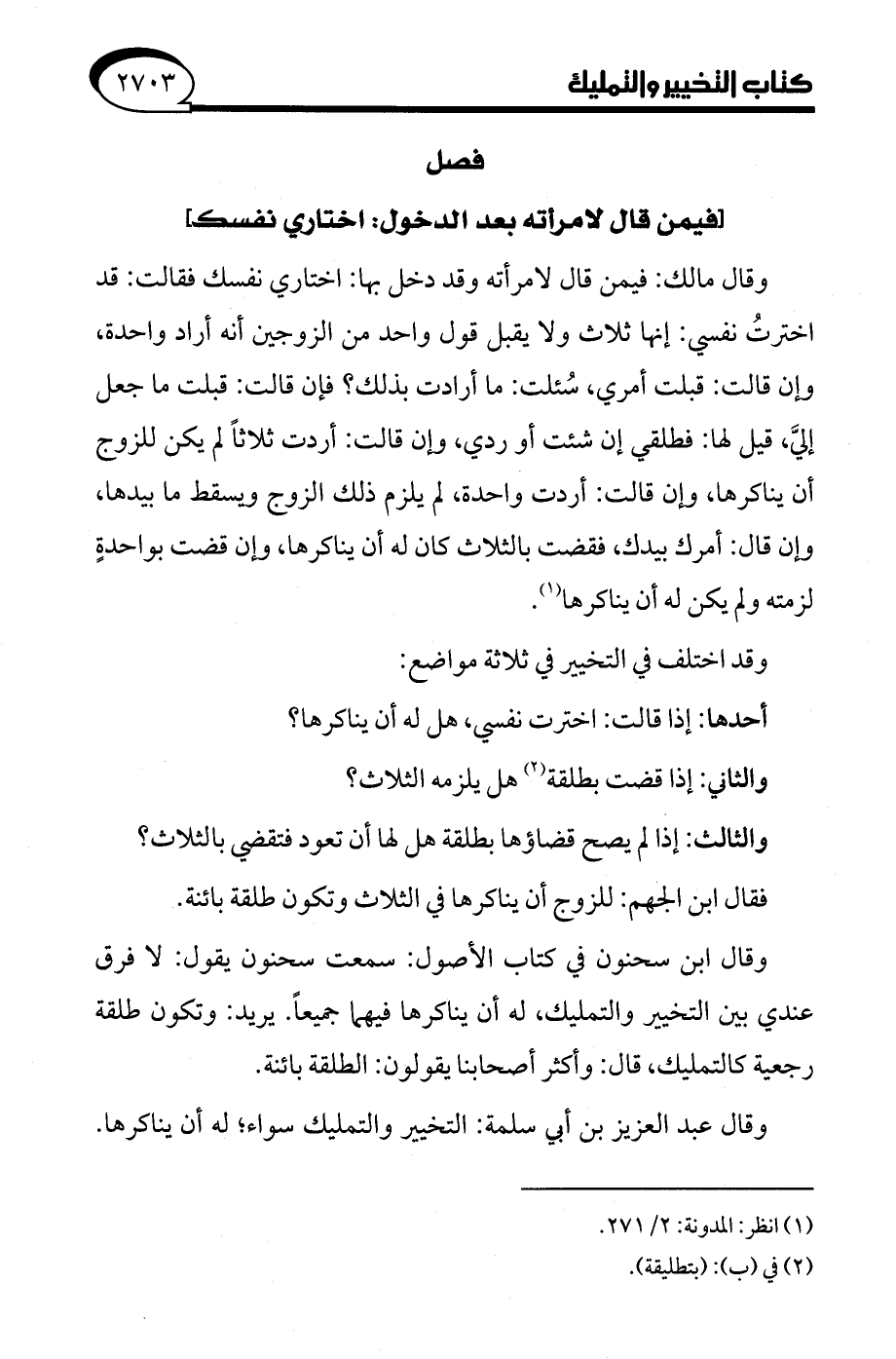 وقال ابن سحنون في كتاب الأصول: سمعت سحنون يقول: لا فرق عندي بين التخيير والتمليك، له أن يناكرها فيهما جميعًا. يريد: وتكون طلقة رجعية كالتمليك، قال: وأكثر أصحابنا يقولون: الطلقة بائنة.