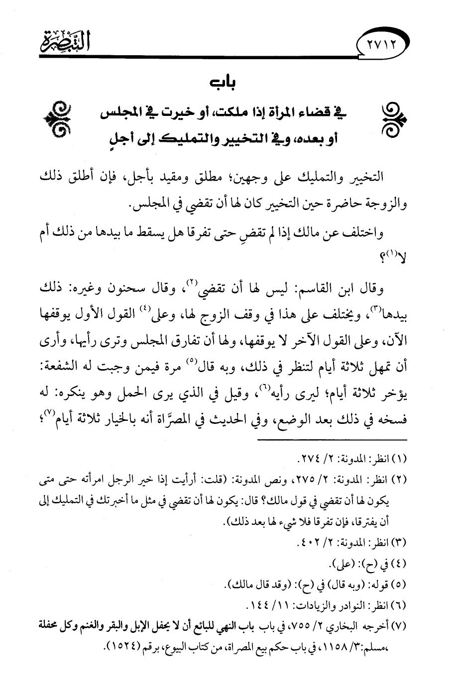 (¬2) انظر: المدونة: 2/ 275، ونص المدونة: (قلت: أرأيت إذا خير الرجل امرأته حتى متى يكون لها أن تقضي في قول مالك؟ قال: يكون لها أن تقضي في مثل ما أخبرتك في التمليك إلى أن يفترقا، فإن تفرقا فلا شيء لها بعد ذلك).