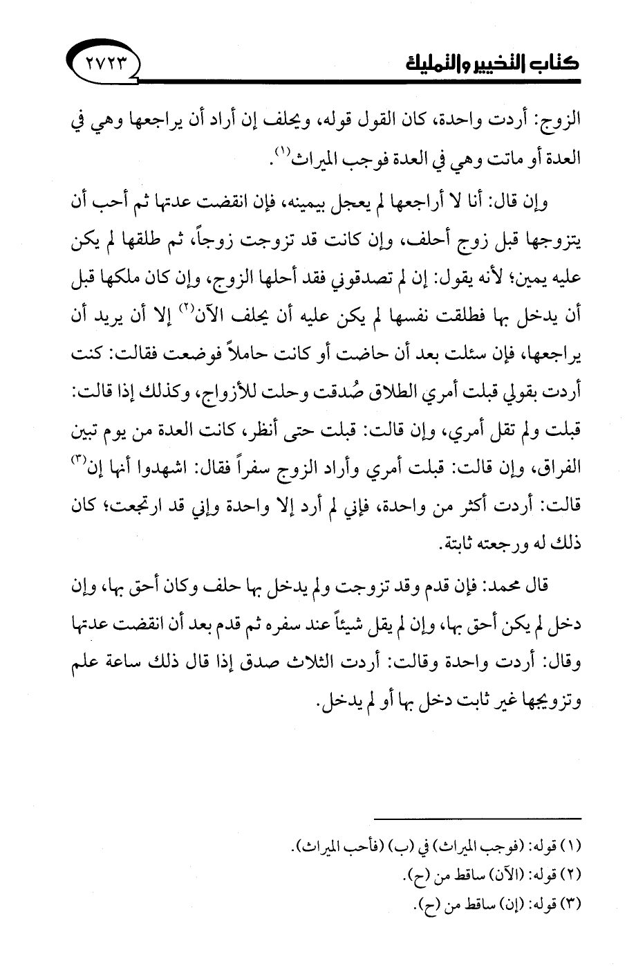 وإن قال: أنا لا أراجعها لم يعجل بيمينه، فإن انقضت عدتها ثم أحب أن يتزوجها قبل زوج أحلف، وإن كانت قد تزوجت زوجًا، ثم طلقها لم يكن عليه يمين؛ لأنه يقول: إن لم تصدقوني فقد أحلها الزوج، وإن كان ملكها قبل أن يدخل بها فطلقت نفسها لم يكن عليه أن يحلف الآن (¬2) إلا أن يريد أن يراجعها، فإن سئلت بعد أن حاضت أو كانت حاملًا فوضعت فقالت: كنت أردت بقولي قبلت أمري الطلاق صُدقت وحلت للأزواج، وكذلك إذا قالت: قبلت ولم تقل أمري، وإن قالت: قبلت حتى أنظر، كانت العدة من يوم تبين الفراق، وإن قالت: قبلت أمري وأراد الزوج سفرًا فقال: اشهدوا أنها إن (¬3) قالت: أردت أكثر من واحدة، فإني لم أرد إلا واحدة وإني قد ارتجعت، كان ذلك له ورجعته ثابتة.