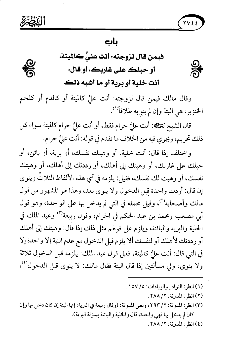 (¬3) انظر: المدونة: 2/ 293، ونص المدونة: (وقال ربيعة في البرية: إنها البتة إن كان دخل بها وإن كان لم يدخل بها فهي واحدة، قال والخلية والبائنة بمنزلة البرية).