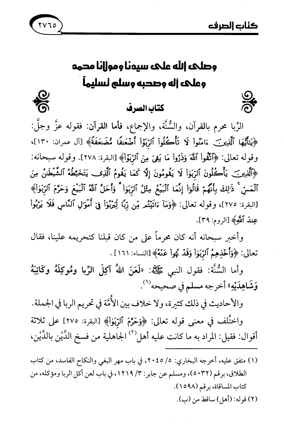 الرِّبا محرم بالقرآن، والسُّنَّة، والإجماع، فأما القرآن: فقوله عزَّ وجلَّ: {يَاأَيُّهَا الَّذِينَ آمَنُوا لَا تَأْكُلُوا الرِّبَا أَضْعَافًا مُضَاعَفَةً} [آل عمران: 130]، وقوله تعالى: {اتَّقُوا اللَّهَ وَذَرُوا مَا بَقِيَ مِنَ الرِّبَا} [البقرة: 278]. وقوله سبحانه: {الَّذِينَ يَأْكُلُونَ الرِّبَا لَا يَقُومُونَ إِلَّا كَمَا يَقُومُ الَّذِي يَتَخَبَّطُهُ الشَّيْطَانُ مِنَ الْمَسِّ ذَلِكَ بِأَنَّهُمْ قَالُوا إِنَّمَا الْبَيْعُ مِثْلُ الرِّبَا وَأَحَلَّ اللَّهُ الْبَيْعَ وَحَرَّمَ الرِّبَا} [البقرة: 275]، وقوله تعالى: {وَمَا آتَيْتُمْ مِنْ رِبًا لِيَرْبُوَ فِي أَمْوَالِ النَّاسِ فَلَا يَرْبُو عِنْدَ اللَّهِ} [الروم: 39].