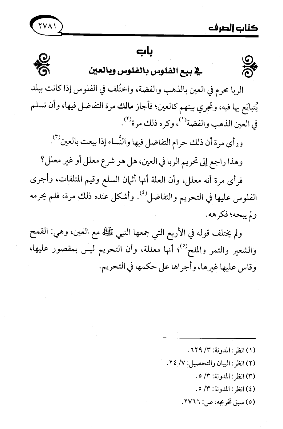 الربا محرم في العين بالذهب والفضة، واختُلف في الفلوس إذا كانت ببلد يُتبايَع بها فيه، وتجري بينهم كالعين، فأجاز مالك مرة التفاضل فيها، وأن تسلم في العين الذهب والفضة (¬1)، وكره ذلك مرة (¬2).