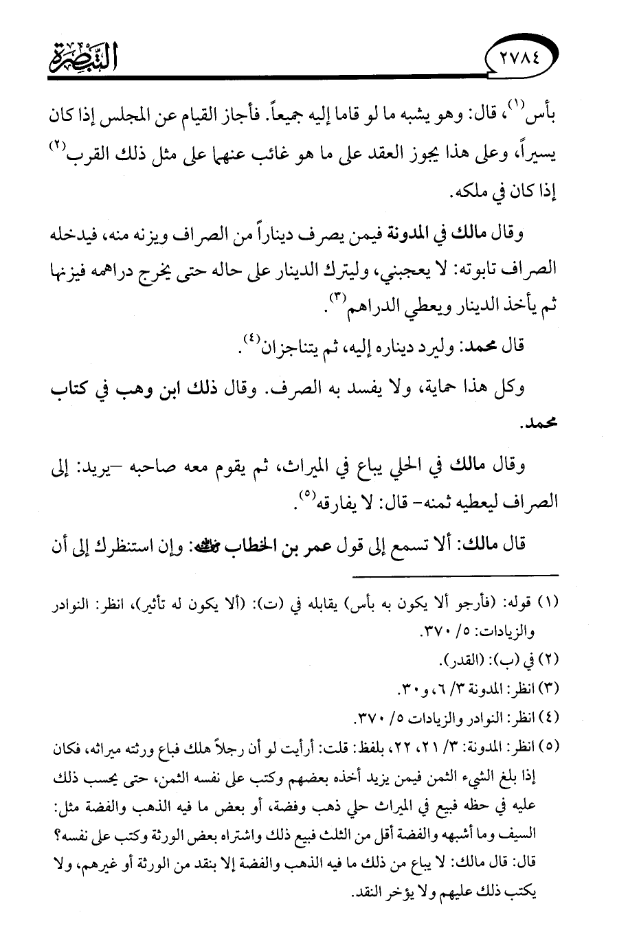 (¬5) انظر: المدونة: 3/ 21، 22، بلفظ: قلت: أرأيت لو أن رجلًا هلك فباع ورثته ميراثه، فكان إذا بلغ الشيء الثمن فيمن يزيد أخذه بعضهم وكتب على نفسه الثمن، حتى يحسب ذلك عليه في حظه فبيع في الميراث حلي ذهب وفضة، أو بعض ما فيه الذهب والفضة مثل: السيف وما أشبهه والفضة أقل من الثلث فبيع ذلك واشتراه بعض الورثة وكتب على نفسه؟ قال: قال مالك: لا يباع من ذلك ما فيه الذهب والفضة إلا بنقد من الورثة أو غيرهم، ولا يكتب ذلك عليهم ولا يؤخر النقد.