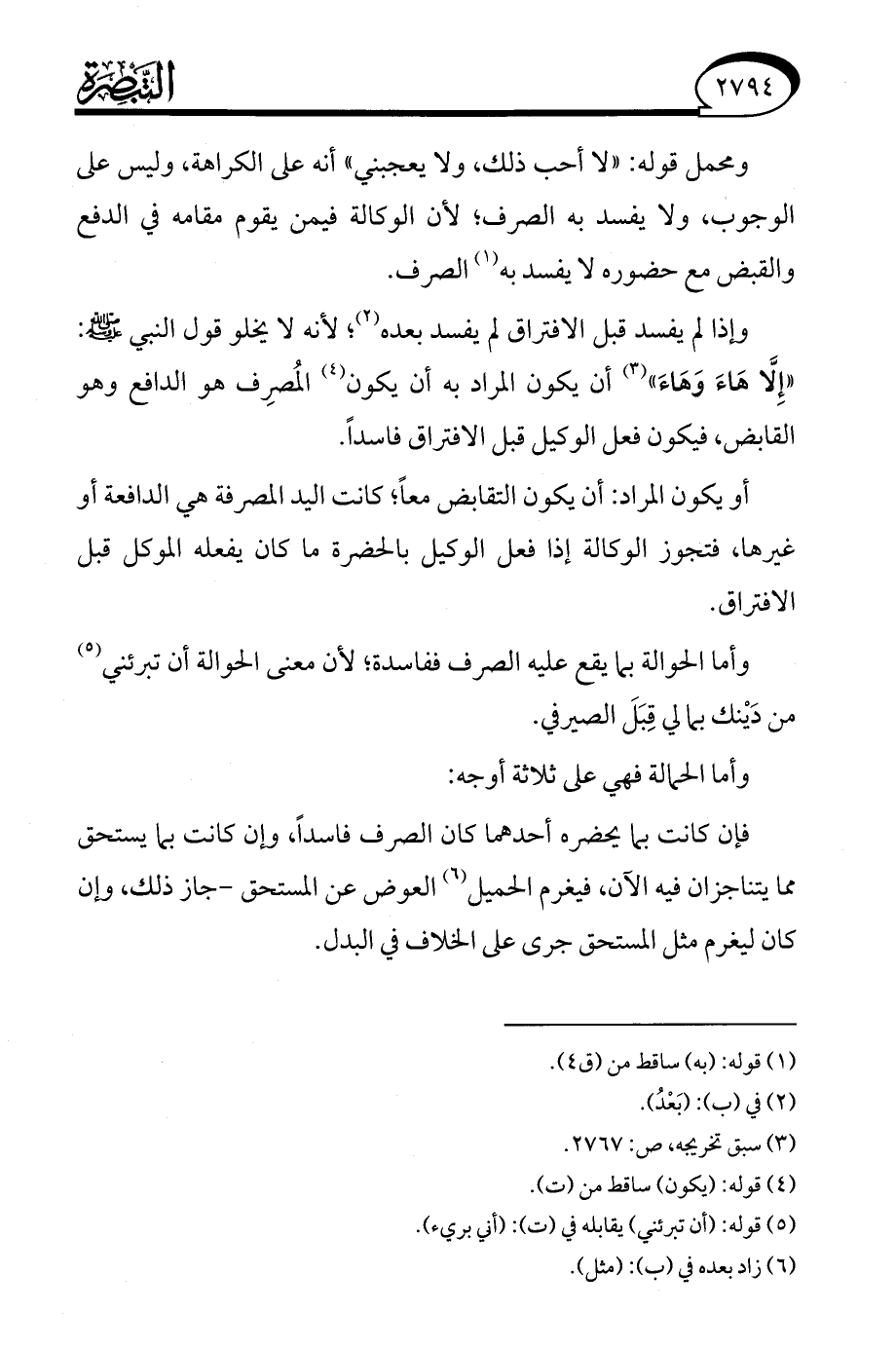 أو يكون المراد: أن يكون التقابض معًا، كانت اليد المصرفة هي الدافعة أو غيرها، فتجوز الوكالة إذا فعل الوكيل بالحضرة ما كان يفعله الموكل قبل الافتراق.