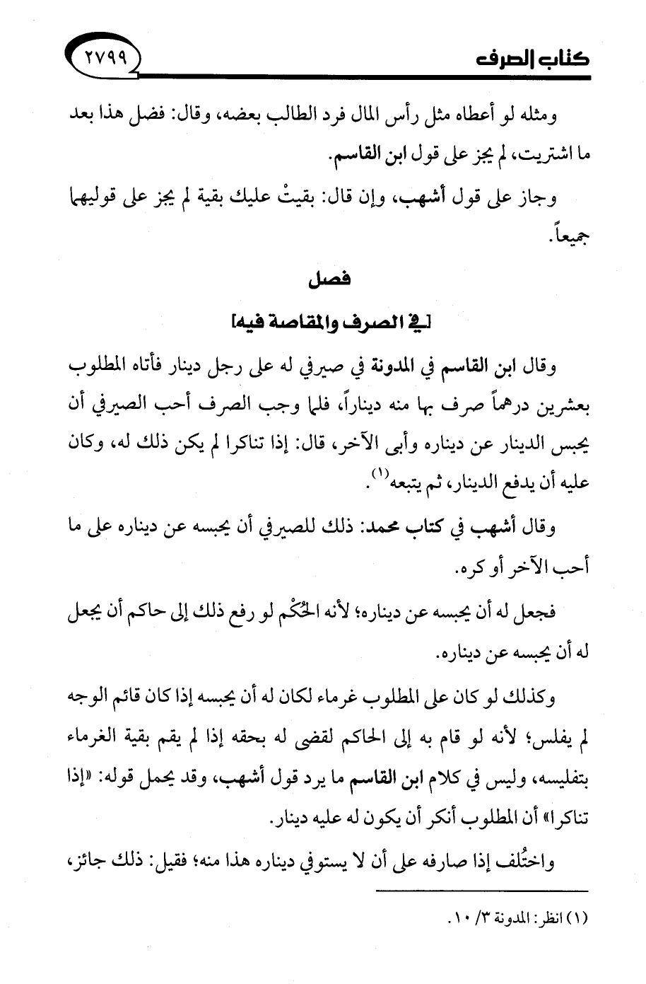 وقال ابن القاسم في المدونة في صيرفي له على رجل دينار فأتاه المطلوب بعشرين درهمًا صرف بها منه دينارًا، فلما وجب الصرف أحب الصيرفي أن يحبس الدينار عن ديناره وأبى الآخر، قال: إذا تناكرا لم يكن ذلك له، وكان عليه أن يدفع الدينار، ثم يتبعه (¬1).