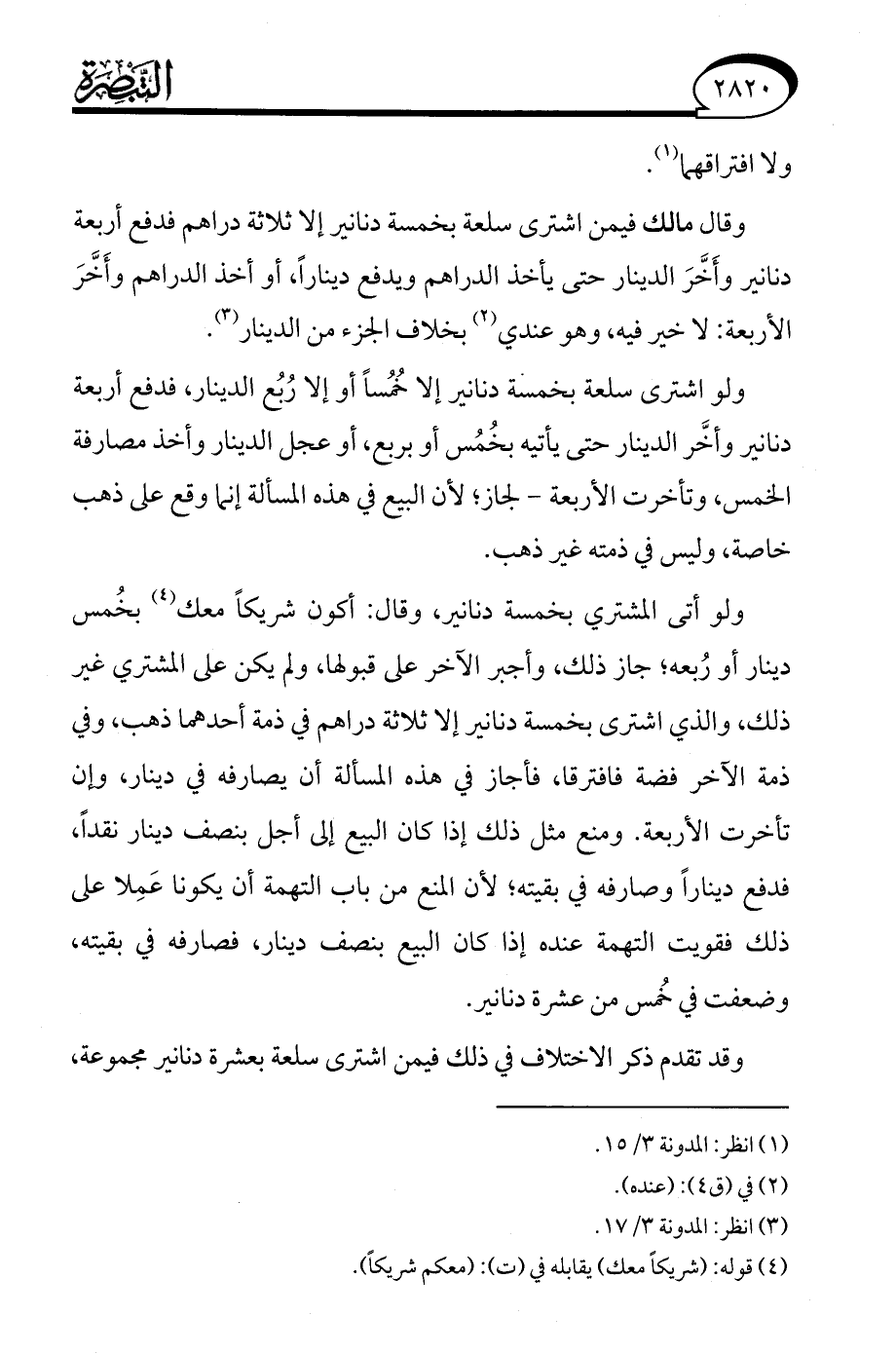ولو أتى المشتري بخمسة دنانير، وقال: أكون شريكًا معك (¬4) بخُمس دينار أو رُبعه، جاز ذلك، وأجبر الآخر على قبولها، ولم يكن على المشتري غير ذلك، والذي اشترى بخمسة دنانير إلا ثلاثة دراهم في ذمة أحدهما ذهب، وفي ذمة الآخر فضة فافترقا، فأجاز في هذه المسألة أن يصارفه في دينار، وإن تأخرت الأربعة. ومنع مثل ذلك إذا كان البيع إلى أجل بنصف دينار نقدًا، فدفع دينارًا وصارفه في بقيته؛ لأن المنع من باب التهمة أن يكونا عَمِلا على ذلك فقويت التهمة عنده إذا كان البيع بنصف دينار، فصارفه في بقيته، وضعفت في خُمس من عشرة دنانير.