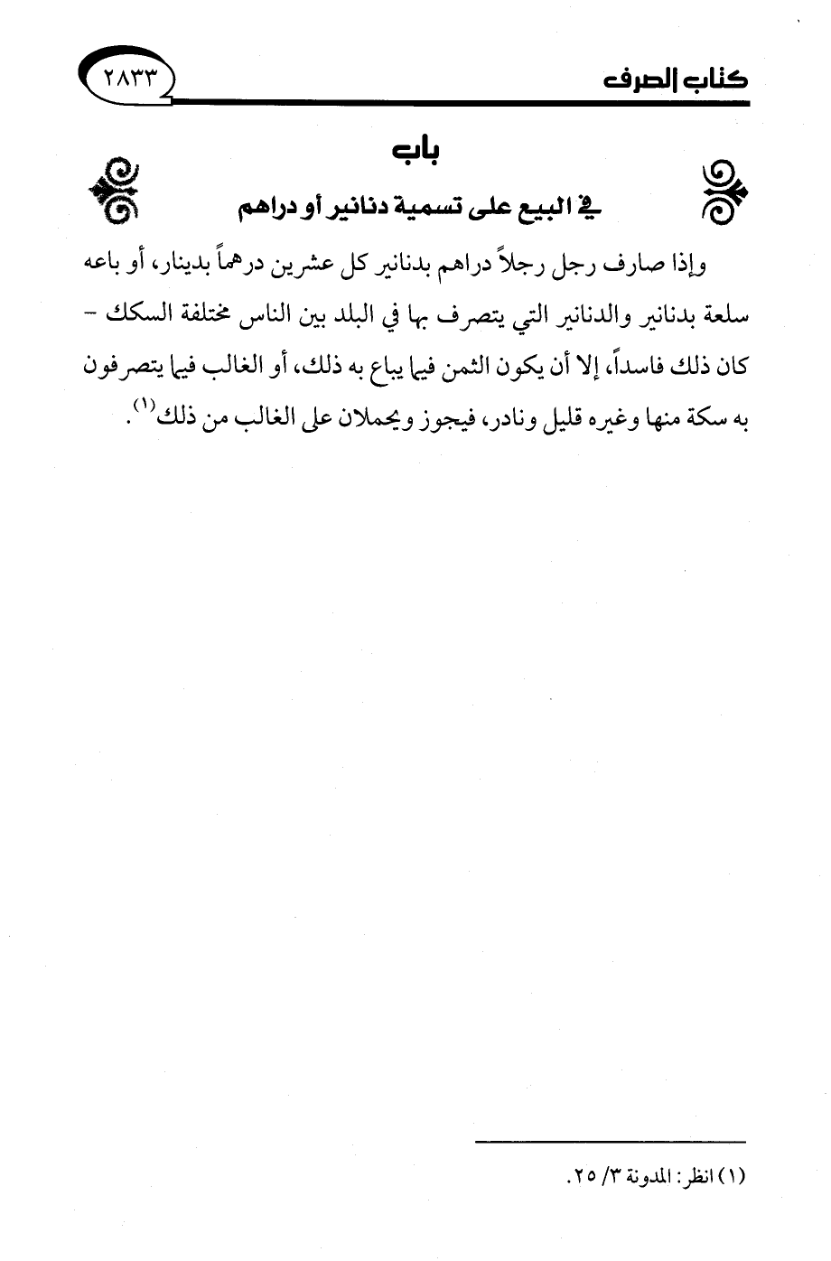 وإذا صارف رجل رجلًا دراهم بدنانير كل عشرين درهمًا بدينار، أو باعه سلعة بدنانير والدنانير التي يتصرف بها في البلد بين الناس مختلفة السكك- كان ذلك فاسدًا، إلا أن يكون الثمن فيما يباع به ذلك، أو الغالب فيما يتصرفون به سكة منها وغيره قليل ونادر، فيجوز ويحملان على الغالب من ذلك (¬1).