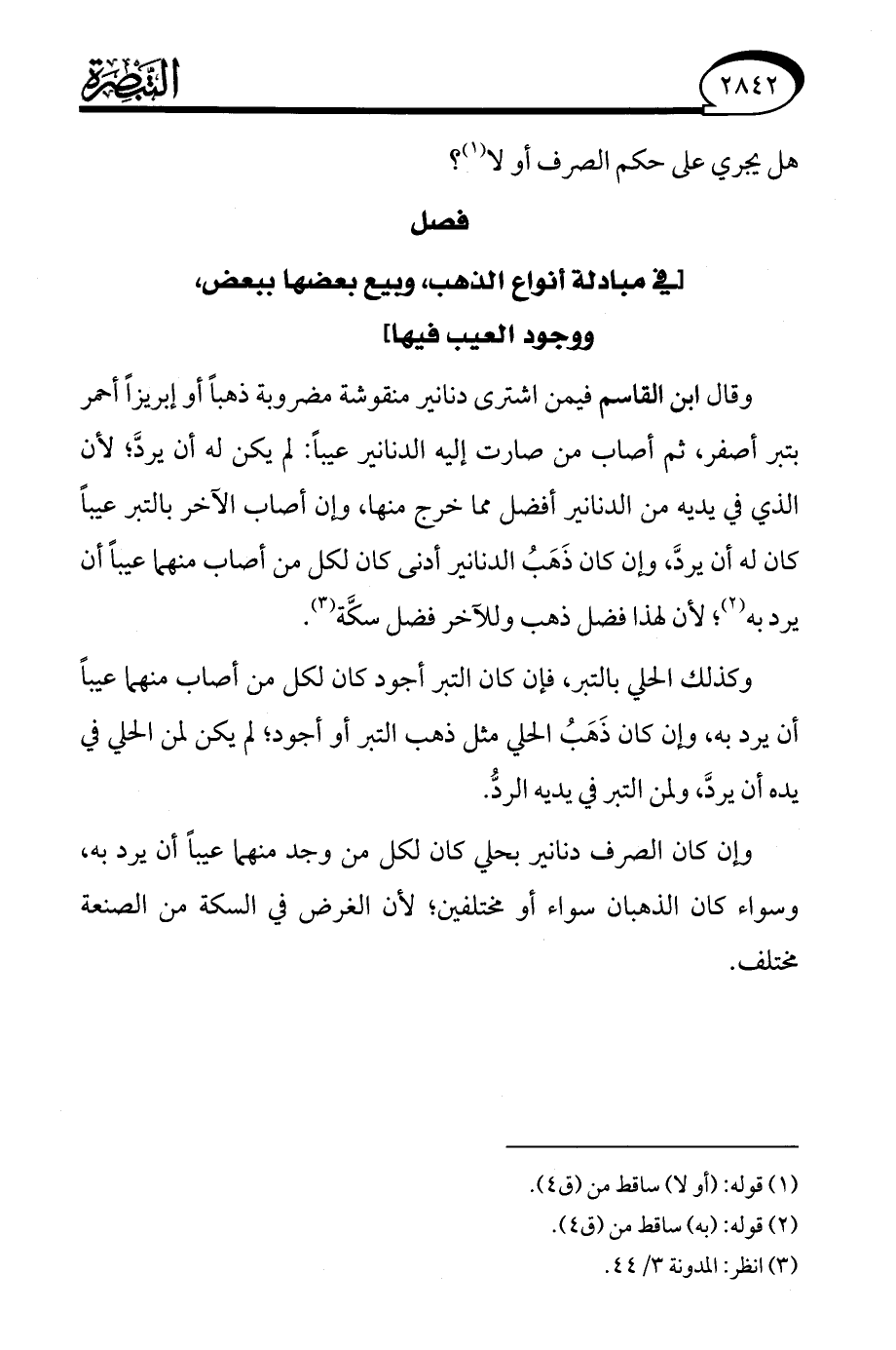 وقال ابن القاسم فيمن اشترى دنانير منقوشة مضروبة ذهبًا أو إبريزًا أحمر بتبر أصفر، ثم أصاب من صارت إليه الدنانير عيبًا: لم يكن له أن يردَّ؛ لأن الذي في يديه من الدنانير أفضل مما خرج منها، وإن أصاب الآخر بالتبر عيبًا كان له أن يردَّ، وإن كان ذَهَبُ الدنانير أدنى كان لكل من أصاب منهما عيبًا أن يرد به (¬2)؛ لأن هذا فضل ذهب وللآخر فضل سكَّة (¬3).
