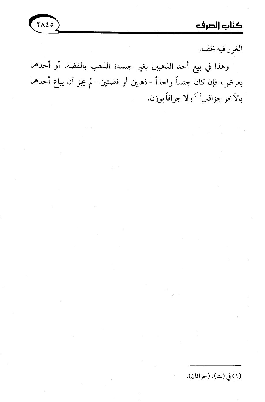 وهذا في بيع أحد الذهبين بغير جنسه، الذهب بالفضة، أو أحدهما بعرض، فإن كان جنسًا واحدًا -ذهبين أو فضتين- لم يجز أن يباع أحدهما بالآخر جزافين (¬1) ولا جزافًا بوزن.