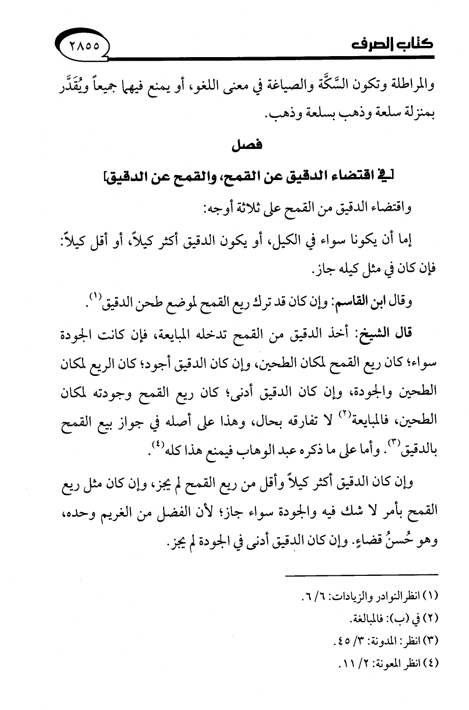 والمراطلة وتكون السَّكَّة والصياغة في معنى اللغو، أو يمنع فيهما جميعًا ويُقَدَّر بمنزلة سلعة وذهب بسلعة وذهب. فصل [في اقتضاء الدقيق عن القمح، والقمح عن الدقيق]