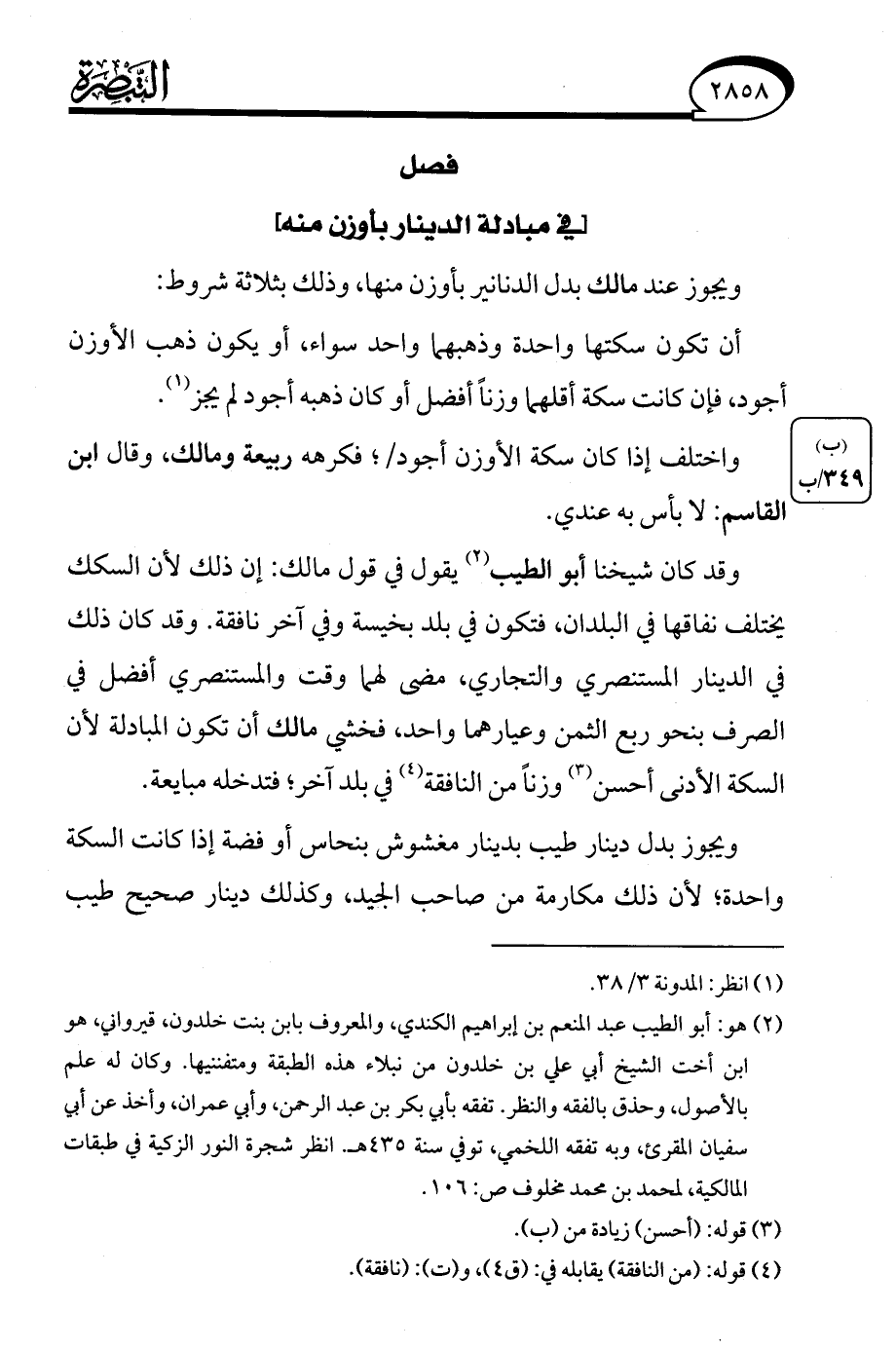 وقد كان شيخنا أبو الطيب (¬2) يقول في قول مالك: إن ذلك لأن السكك يختلف نفاقها في البلدان، فتكون في بلد بخيسة وفي آخر نافقة. وقد كان ذلك في الدينار المستنصري والتجاري، مضى لهما وقت والمستنصري أفضل في الصرف بنحو ربع الثمن وعيارهما واحد، فخشي مالك أن تكون المبادلة لأن السكة الأدنى أحسن (¬3) وزنًا من النافقة (¬4) في بلد آخر، فتدخله مبايعة.