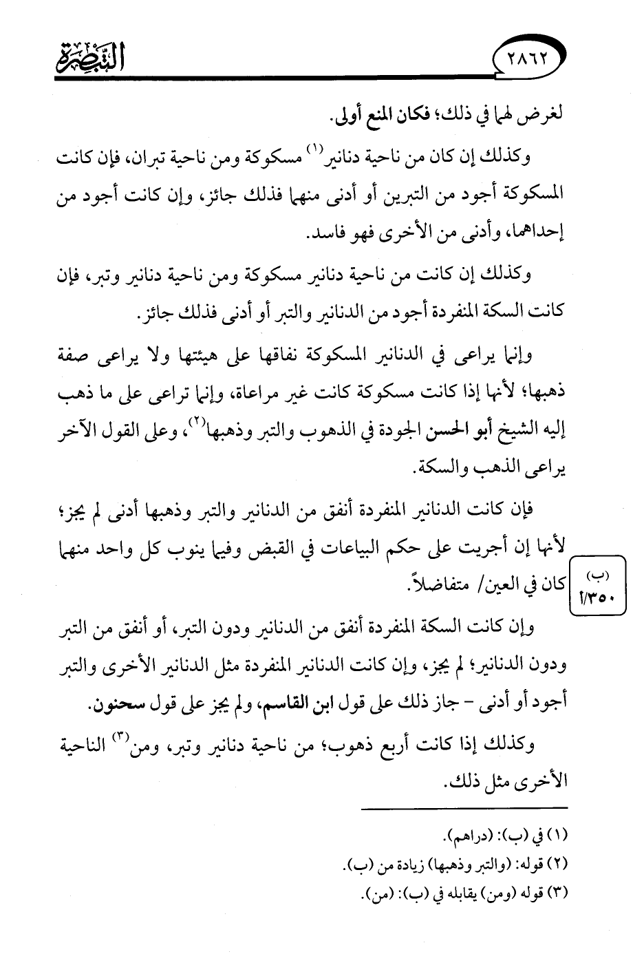 وإنما يراعى في الدنانير المسكوكة نفاقها على هيئتها ولا يراعى صفة ذهبها؛ لأنها إذا كانت مسكوكة كانت غير مراعاة، وإنما تراعى على ما ذهب إليه الشيخ أبو الحسن الجودة في الذهوب والتبر وذهبها (¬2)، وعلى القول الآخر يراعى الذهب والسكة.