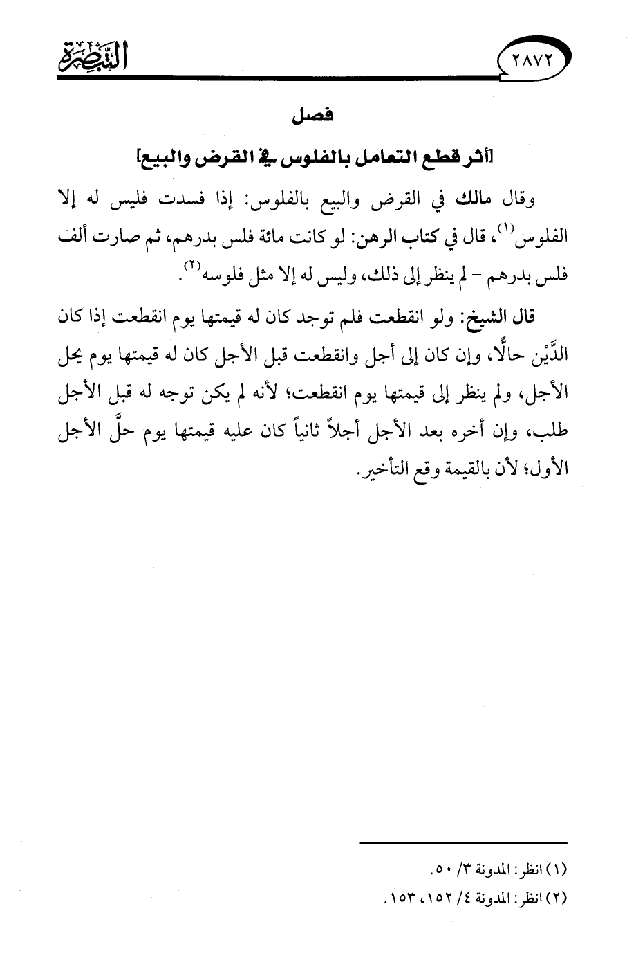 وقال مالك في القرض والبيع بالفلوس: إذا فسدت فليس له إلا الفلوس (¬1)، قال في كتاب الرهن: لو كانت مائة فلس بدرهم، ثم صارت ألف فلس بدرهم- لم ينظر إلى ذلك، وليس له إلا مثل فلوسه (¬2).