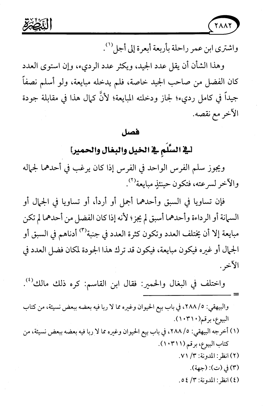 فإن تساويا في السبق وأحدهما أجمل أو أردأ، أو تساويا في الجمال أو السمانة أو الرداءة وأحدهما أسبق لم يجز؛ لأنه إذا كان الفضل من أحدهما لم تكن مبايعة إلا أن يختلف العدد وتكون كثرة العدد في جنبة (¬3) أدناهم في السبق أو الجمال أو غيره فيكون مبايعة، فيكون قد ترك هذا الجودة لمكان فضل العدد في الآخر.