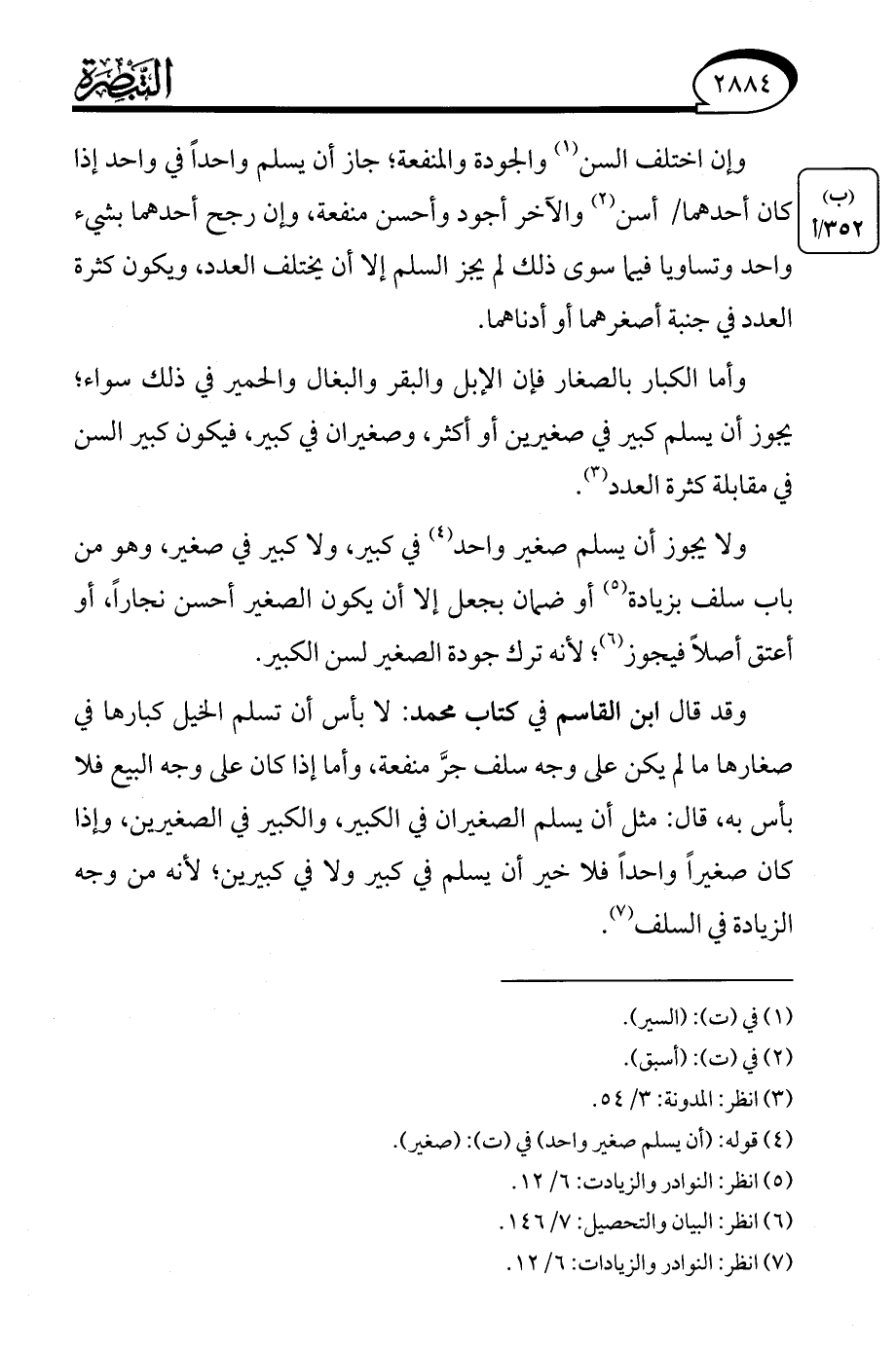 وقد قال ابن القاسم في كتاب محمد: لا بأس أن تسلم الخيل كبارها في صغارها ما لم يكن على وجه سلف جرَّ منفعة، وأما إذا كان على وجه البيع فلا بأس به، قال: مثل أن يسلم الصغيران في الكبير، والكبير في الصغيرين، وإذا كان صغيرًا واحدًا فلا خير أن يسلم في كبير ولا في كبيرين؛ لأنه من وجه الزيادة في السلف (¬7).