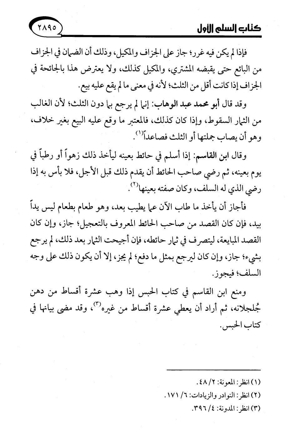 وقال ابن القاسم: إذا أسلم في حائط بعينه ليأخذ ذلك زهوًا أو رطبًا في يوم بعينه، ثم رضي صاحب الحائط أن يقدم ذلك قبل الأجل، فلا بأس به إذا رضي الذي له السلف، وكان صفته بعينها (¬2).
