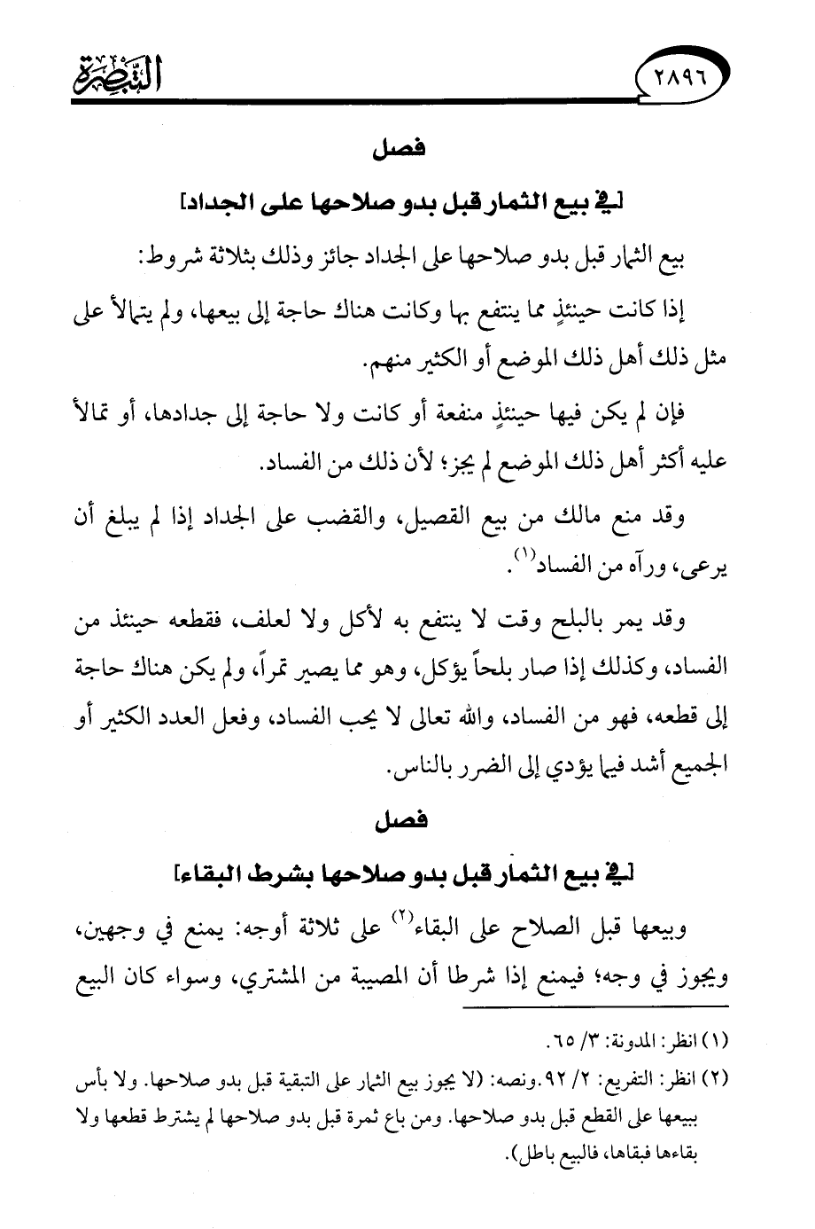 (¬2) انظر: التفريع: 2/ 92. ونصه: (لا يجوز بيع الثمار على التبقية قبل بدو صلاحها. ولا بأس ببيعها على القطع قبل بدو صلاحها. ومن باع ثمرة قبل بدو صلاحها لم يشترط قطعها ولا بقاءها فبقاها، فالبيع باطل).