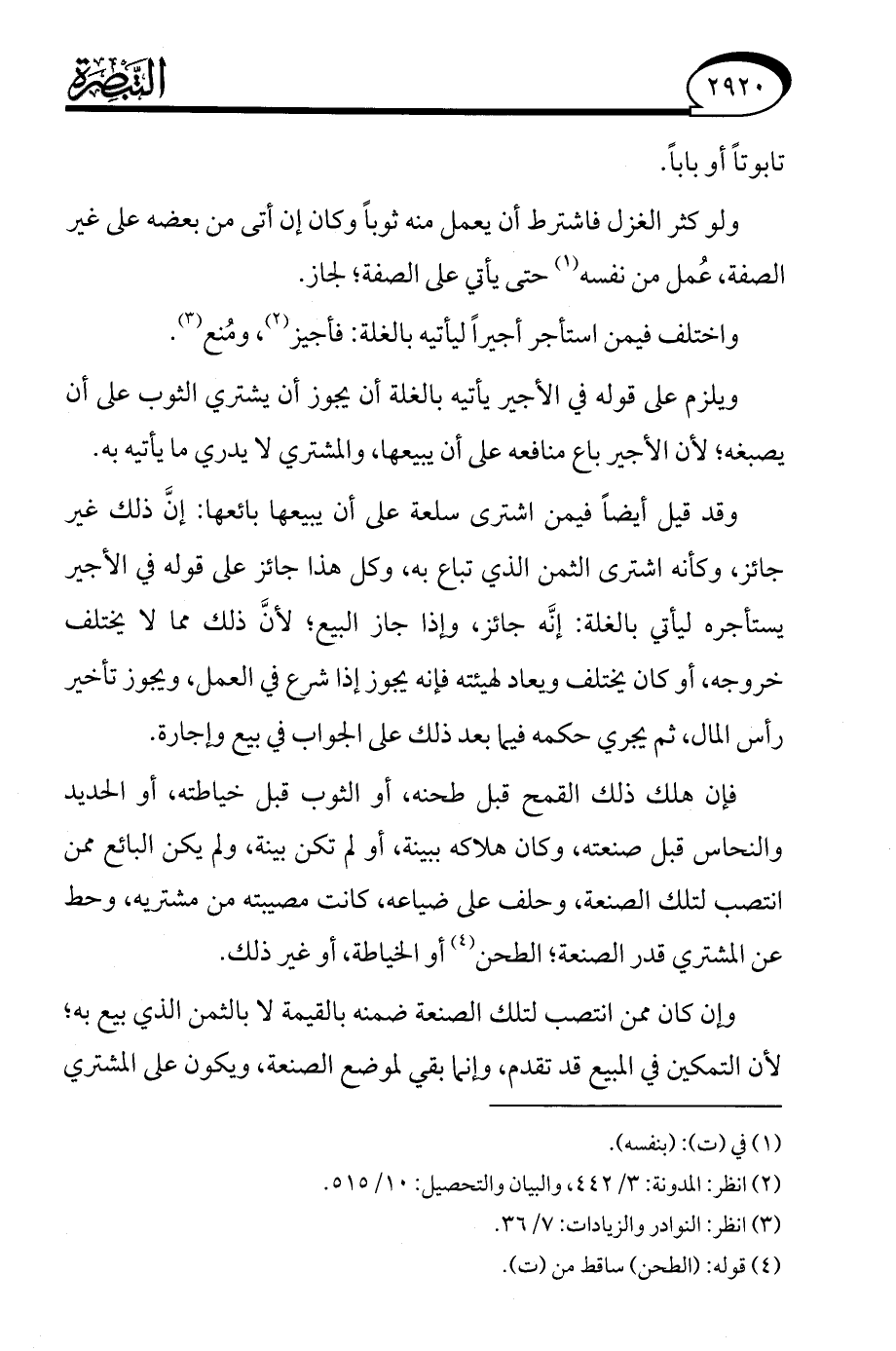 فإن هلك ذلك القمح قبل طحنه، أو الثوب قبل خياطته، أو الحديد والنحاس قبل صنعته، وكان هلاكه ببينة، أو لم تكن بينة، ولم يكن البائع ممن انتصب لتلك الصنعة، وحلف على ضياعه، كانت مصيبته من مشتريه، وحط عن المشتري قدر الصنعة، الطحن (¬4) أو الخياطة، أو غير ذلك.