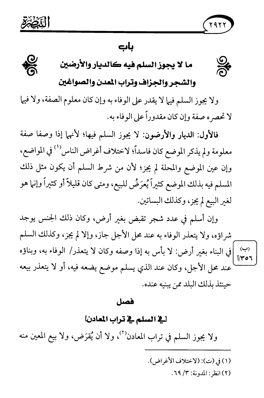 فالأول: الديار والأرضون: لا يجوز السلم فيها؛ لأنهما إذا وصفا صفة معلومة ولم يذكر الموضع كان فاسدًا، لاختلاف أغراض الناس (¬1) في المواضع، وإن عين الموضع والمحلة لم يجز؛ لأن من شرط السلم أن يكون مثل ذلك المسلم فيه بذلك الموضع كثيرًا يُعرَضُ للبيع، ومتى كان قليلًا أو كثيرًا وإنما هو لغير البيع لم يجز، وكذلك البساتين.