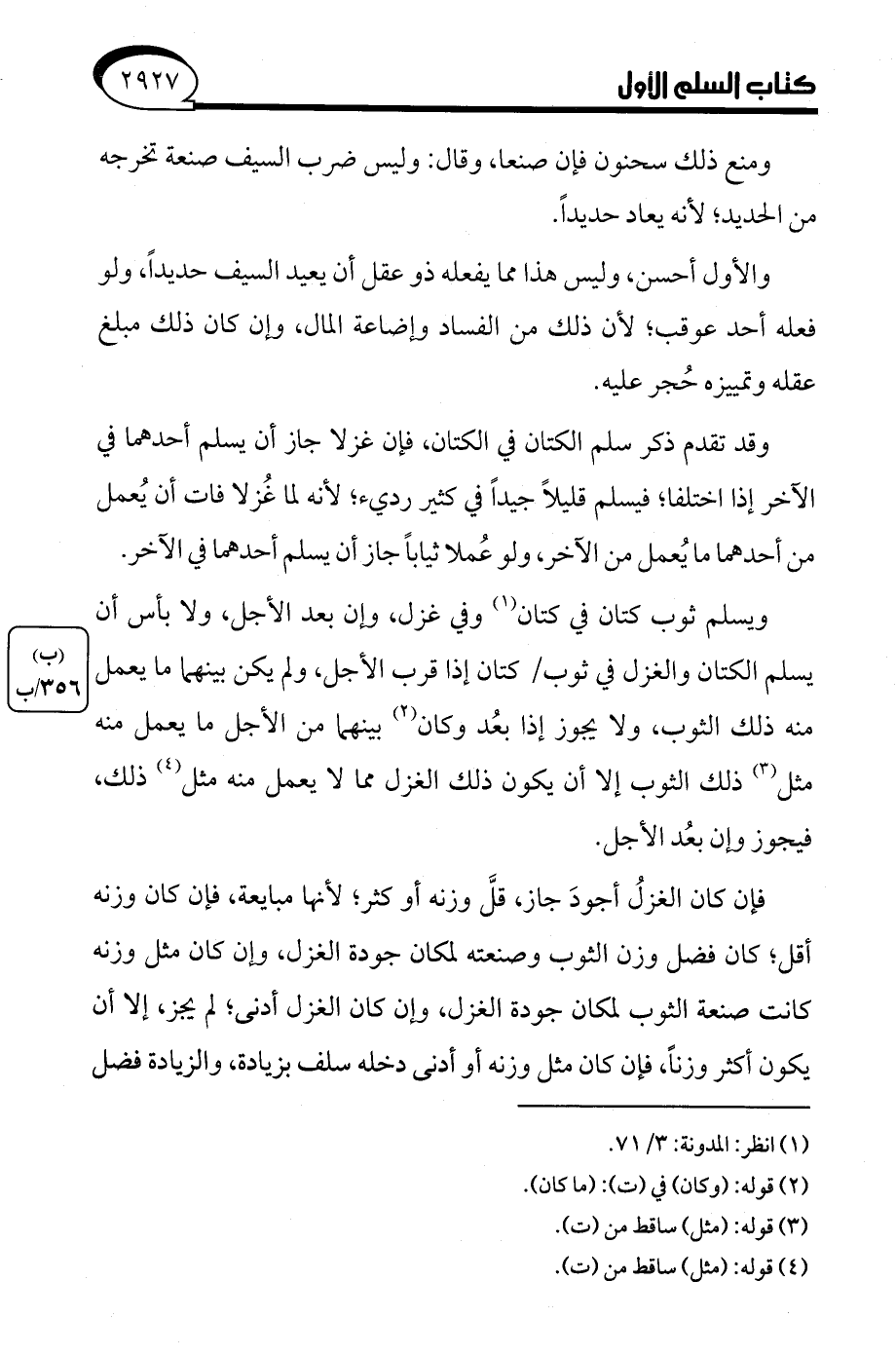 وقد تقدم ذكر سلم الكتان في الكتان، فإن غزلا جاز أن يسلم أحدهما في الآخر إذا اختلفا، فيسلم قليلًا جيدًا في كثير رديء؛ لأنه لما غُزلا فات أن يُعمل من أحدهما ما يُعمل من الآخر، ولو عُملا ثيابًا جاز أن يسلم أحدهما في الآخر.