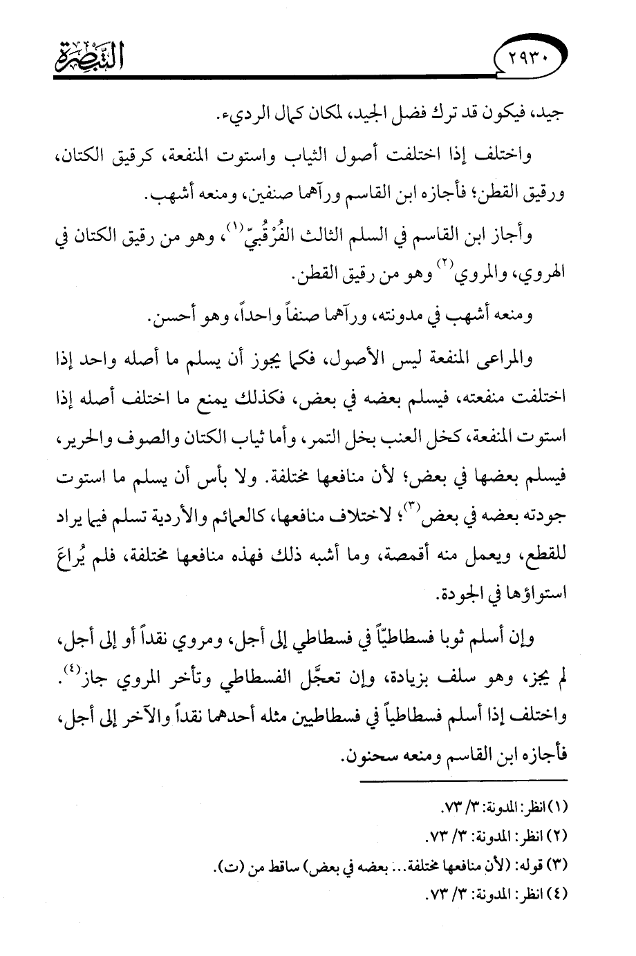 والمراعى المنفعة ليس الأصول، فكما يجوز أن يسلم ما أصله واحد إذا اختلفت منفعته، فيسلم بعضه في بعض، فكذلك يمنع ما اختلف أصله إذا استوت المنفعة، كخل العنب بخل التمر، وأما ثياب الكتان والصوف والحرير، فيسلم بعضها في بعض؛ لأن منافعها مختلفة. ولا بأس أن يسلم ما استوت جودته بعضه في بعض (¬3)، لاختلاف منافعها، كالعمائم والأردية تسلم فيما يراد للقطع، ويعمل منه أقمصة، وما أشبه ذلك فهذه منافعها مختلفة، فلم يُراعَ استواؤها في الجودة.