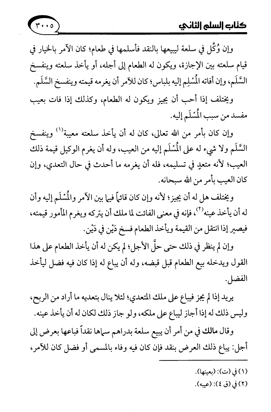 وإن وُكِّل في سلعة ليبيعها بالنقد فأسلمها في طعام، كان الآمر بالخيار في قيام سلعته بين الإجازة، ويكون له الطعام إلى أجله، أو يأخذ سلعته وينفسخ السَّلَم، وإن أفاته المُسْلِم إليه بلباس، كان للآمر أن يغرمه قيمته وينفسخ السَّلَم.