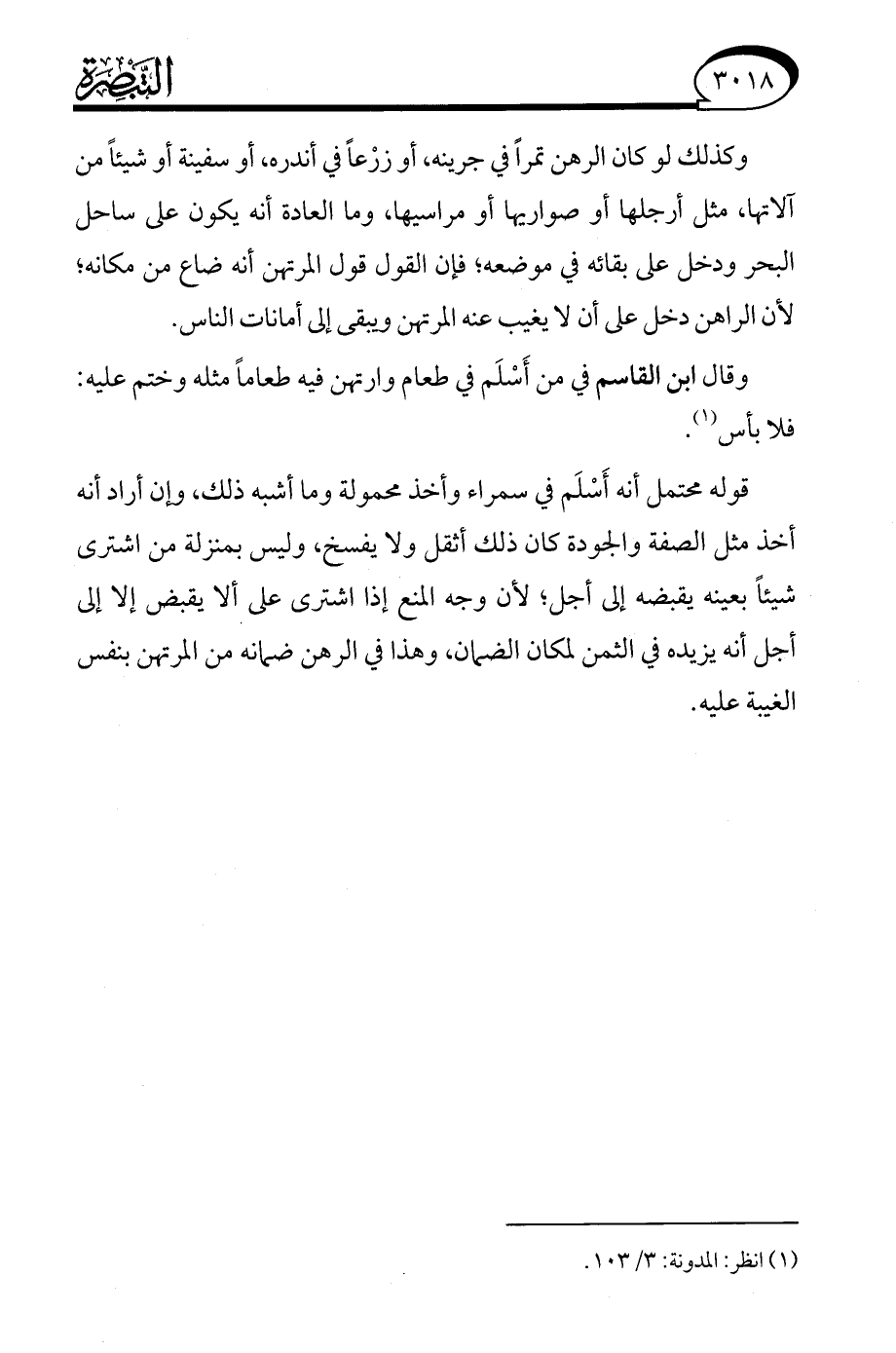 وكذلك لو كان الرهن تمرًا في جرينه، أو زرْعًا في أندره، أو سفينة أو شيئًا من آلاتها، مثل أرجلها أو صواريها أو مراسيها، وما العادة أنه يكون على ساحل البحر ودخل على بقائه في موضعه، فإن القول قول المرتهن أنه ضاع من مكانه؛ لأن الراهن دخل على أن لا يغيب عنه المرتهن ويبقى إلى أمانات الناس.